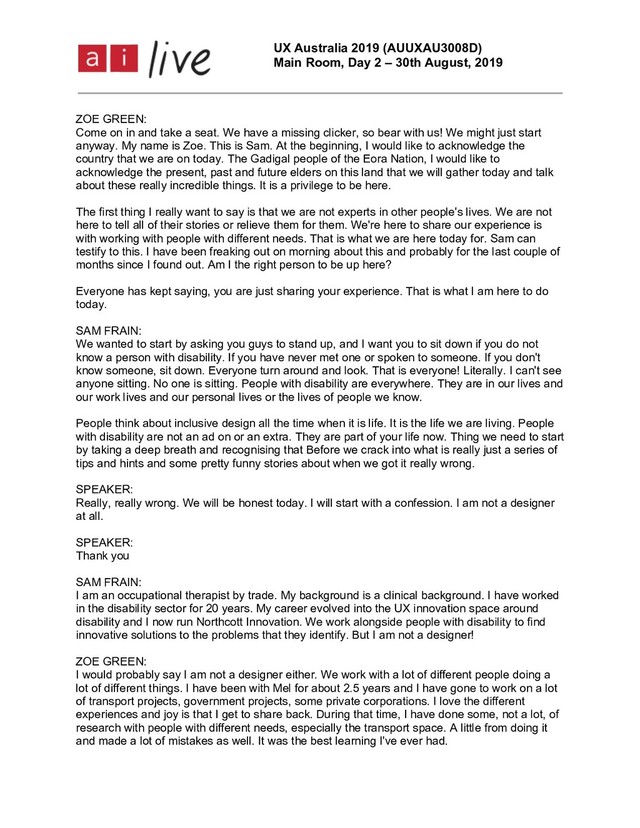 August, 2019 Page 2 of 10 We want to start about by talking, who are we building inclusion for and how are we doing that? Designing for everyone is kind of hard, we're talking about all and when we say all, we really mean all. When we think about the population in terms of that sort of bell curve, and every single population group you can map out on a bell curve. When we say all, we mean the really... People at the pointy ends as well. Even though that is more of a challenge, all means all. Those of you who do not know Heather Simmons, she talks about the 12 values of inclusion. They are sort of principles of how you could approach anything, be it your everyday life, your workplace. The 12 values are really amazing and equally overwhelming. Even though I have spent my entire career in the disability sector, I still read those 12 values and go, oh, God, are you really living up to this? It is really hard. The speakers that were before us, when we have marginalised communities, our people born in or is that was, you know, we have put a barrier to them being included in that context? Today, I wanted to sort of highlight these four once. People with disability are born in. We all said we all know one or work with one or are related to one or are friends with one, people with disability, they are in already. We should not have to include them will stop they are in. All the means all. That is saying that irrespective of someone support needs or their circumstances or lived experiences, and irrespective of whether they are the bell curve, they should also be included in whatever is you are doing. Everyone in support. This is a really interesting one. If we think about our day-to-day lives, everyone needs support to do different things. If I think about my day-to-day life, I have two small children. A six-year-old needs an insane amount of support to put his school uniform. The number of times I have circled back around and told them to put his shirt on, just put it on! I am so repetitive. Every single morning. He needs support just to get addressed. He does not have additional needs, he is just a six-year-old. If you think about a university lecture, I will call the person question girl. She keeps putting her hand up and it just replaces the last sentence the lecturer said. You just wanted to stop. That person needs to keep asking this question because that is the kind of support they need to understand that topic. There might be someone else in this room... Can anyone else hear the air conditioner, it is super loud. There might people in this room, for them, they may need additional support to tune out that air conditioner. It is really loud. And to concentrate on what is happening in this room. Everyone needs support, it does not have to look like a support worker, a white cane, a hearing aid. I think that is a good tip to remember. Everyone can contribute. Irrespective of how you communicate, how you present, what you look like, everyone has a right to pitch in and give their contribution. The effort since with us. It is our job to make sure they can contribute. They have the skills and capacity to pitch in with whatever the activity is. It is our job to remove those barriers so that they can contribute. They have the skill, we just need to create the space for them to do that. ZOE GREEN:
