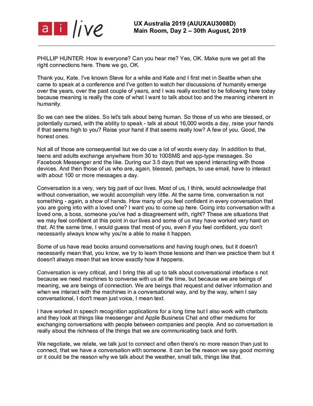 August, 2019 Page 2 of 10 So conversation, to take us even a further step back, the conversation is the human interface. It is how we interface with each other. When we communicate we are, with language, we are adopt ing something that most of us believe we share to some degree, which is an interface. The same thing that we build in our digital worlds. Pardon me while I try to read what's in front of me. Meaning requires multiple levels of context. Most of us, we're designers, we know this. We work with context. We work with content. We work with crafting flow. However, we don't often think about what makes up that meaning. It's culture, it's self-owned knowledge, it's impuded knowledge that we assume someone else has, it's tonal quality to our voice, gestures, visual, other visual signals, the environment that we're in. All of those things bring meaning to each and every conversation that we have. We use conversation to engage and fulfil social contracts. I had many conversations about coming to Sydney to speak to you today. We have many conversations about getting work done. Those of us who are in long-term committed relationships will have many conversation s about that relationship. Meaning goes deep and broad. Meaning shows up in diverse and wide-meaning ways. It shows up as story, persuasion, negotiation, teaching, comfort, poetry, debate, explanation, commiseration, resolution, play, inquiry, defence, entertainment, just a partial list of all of these things. And when we use it, it's not just recognition of words, of static definitions, it's detailed, it's complex, it's subtle, it's sophisticated, it's conceptual, it's inferential. The reason I'm talking to you today is our machines aren't doing that with us. We are ignoring these things by and large in our machines. You can see a quote here from about the idea of mutual responsibility in conversation. The participants are trying to establish at the initiation of each new interaction, each new contribution, the mutual belief that we understand each other, that we know what we're talking about. How many of you have had a conversation one day with someone and walked away from it thinking wow, they really got me, we were aligned on a course of action, we know what we're going to do. A week later the thing that gets done is not what you agreed on and you go back to them and you all of a sudden it becomes clear that you had two entirely different understandings of what happened. That happen to anyone? Raise your hand. Yeah, more than a few of us. It's human. When we think about machines doing that, machines that are not necessarily built around meaning. Machines that are not designed or applications that are not designed to do that negotiation, think of all that we aren't even trying to do there. When we have to work so hard with each other, and our machines aren't even built yet to do this. And another example of why this is so important, and I don't usually like to - I take that back, I always have too much text on my slides. This is a Twitter exchange I came across just yesterday. It's remarkable this showed up, I was so pleased. A woman who is a speech language pathologist, meaning that she works with often children but sometimes adults as well on language issues, and not just - often the mechanics but not just the mechanics. More importantly the delivery and reception of meaning.
