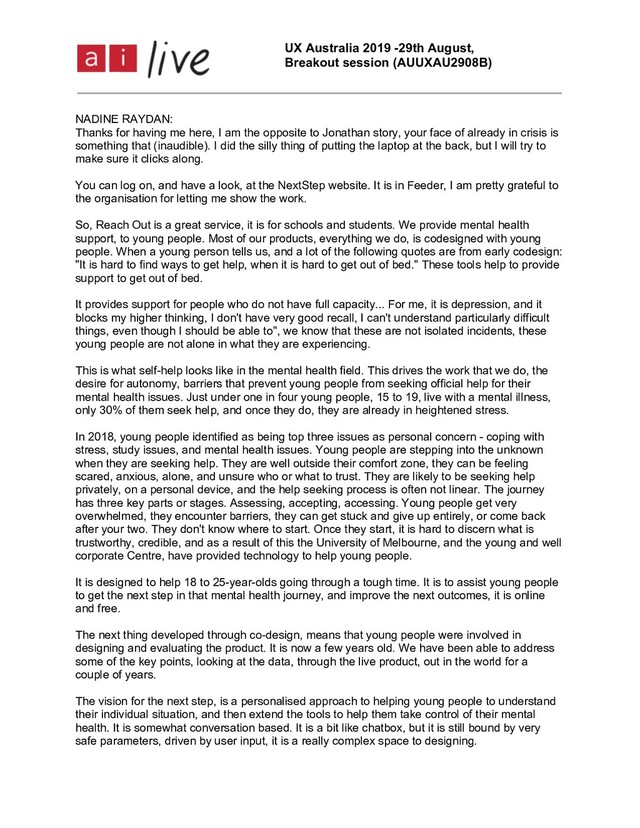 Thanks for having me here, I am the opposite to Jonathan story, your face of already in crisis is something that (inaudible). I did the silly thing of putting the laptop at the back, but I will try to make sure it clicks along. You can log on, and have a look, at the NextStep website. It is in Feeder, I am pretty grateful to the organisation for letting me show the work. So, Reach Out is a great service, it is for schools and students. We provide mental health support, to young people. Most of our products, everything we do, is codesigned with young people. When a young person tells us, and a lot of the following quotes are from early codesign: "It is hard to find ways to get help, when it is hard to get out of bed." These tools help to provide support to get out of bed. It provides support for people who do not have full capacity... For me, it is depression, and it blocks my higher thinking, I don't have very good recall, I can't understand particularly difficult things, even though I should be able to", we know that these are not isolated incidents, these young people are not alone in what they are experiencing. This is what self-help looks like in the mental health field. This drives the work that we do, the desire for autonomy, barriers that prevent young people from seeking official help for their mental health issues. Just under one in four young people, 15 to 19, live with a mental illness, only 30% of them seek help, and once they do, they are already in heightened stress. In 2018, young people identified as being top three issues as personal concern - coping with stress, study issues, and mental health issues. Young people are stepping into the unknown when they are seeking help. They are well outside their comfort zone, they can be feeling scared, anxious, alone, and unsure who or what to trust. They are likely to be seeking help privately, on a personal device, and the help seeking process is often not linear. The journey has three key parts or stages. Assessing, accepting, accessing. Young people get very overwhelmed, they encounter barriers, they can get stuck and give up entirely, or come back after your two. They don't know where to start. Once they start, it is hard to discern what is trustworthy, credible, and as a result of this the University of Melbourne, and the young and well corporate Centre, have provided technology to help young people. It is designed to help 18 to 25-year-olds going through a tough time. It is to assist young people to get the next step in that mental health journey, and improve the next outcomes, it is online and free. The next thing developed through co-design, means that young people were involved in designing and evaluating the product. It is now a few years old. We have been able to address some of the key points, looking at the data, through the live product, out in the world for a couple of years. The vision for the next step, is a personalised approach to helping young people to understand their individual situation, and then extend the tools to help them take control of their mental health. It is somewhat conversation based. It is a bit like chatbox, but it is still bound by very safe parameters, driven by user input, it is a really complex space to designing.