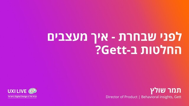 בהרצאה תמר תראה דוגמאות לאופן שבו מיישמים מחקר מכלכלה התנהגותית ב-Gett כדי להשפיע על קבלת החלטות אצל משתמשים. עבור כל מקרה, תמר תציג את העיקרון התיאורטי שעמד מאחורי הניסוי, היישום המוצרי, והתוצאות: מה עבד, מה פחות, מה הצוות ב-Gett למד בעקבות זה, ומה אתם יכולים לקחת למוצרים שלכם.