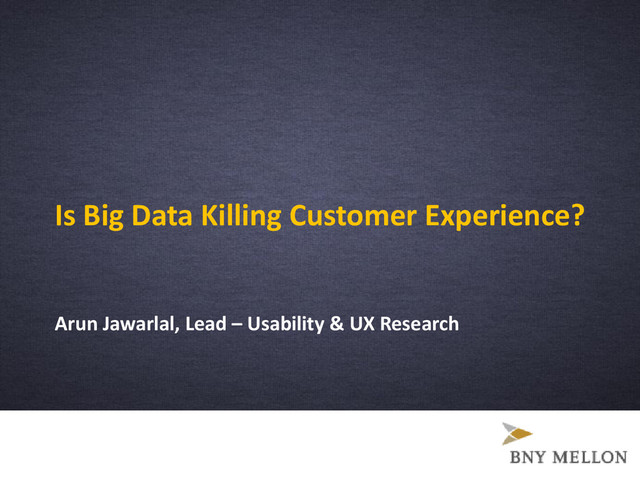 We as User Experience professionals have always had a responsibility to raise questions on ROI (Return on Investment) of organizations. We have been paramount in saving millions of Dollars being squandered into IT where users have never been given key importance. We all have a new responsibility - Taming Big Data.