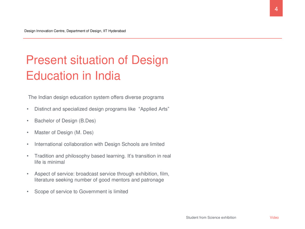 Department of Design, IIT Hyderabad 4 The Indian design education system offers diverse programs • Distinct and specialized design programs like “Applied Arts” • Bachelor of Design (B.Des) • Master of Design (M. Des) • International collaboration with Design Schools are limited • Tradition and philosophy based learning. It‟s transition in real life is minimal • Aspect of service: broadcast service through exhibition, film, literature seeking number of good mentors and patronage • Scope of service to Government is limited Student from Science exhibition Video