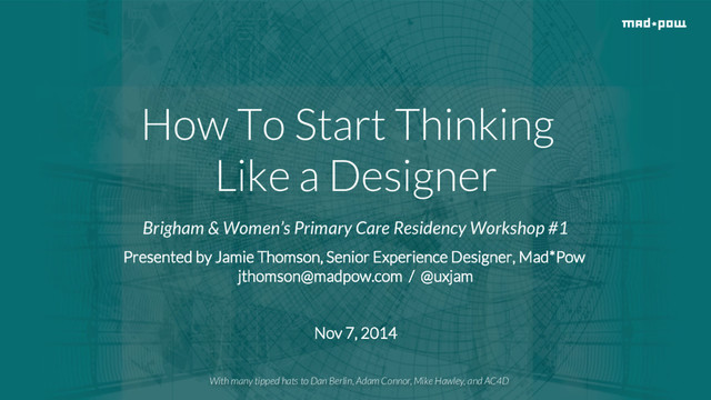 Primary Care Residency Workshop #1 Presented by Jamie Thomson, Senior Experience Designer, Mad*Pow [email protected] / @uxjam Nov 7, 2014 With many tipped hats to Dan Berlin, Adam Connor, Mike Hawley, and AC4D
