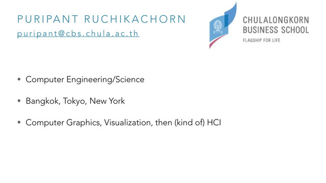 b s . c h u l a . a c . t h P U R I PA N T R U C H I K A C H O R N • Computer Engineering/Science • Bangkok, Tokyo, New York • Computer Graphics, Visualization, then (kind of) HCI