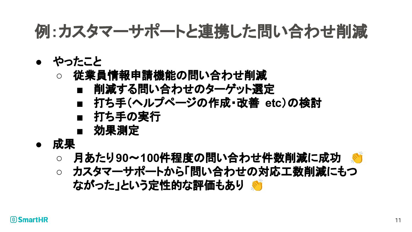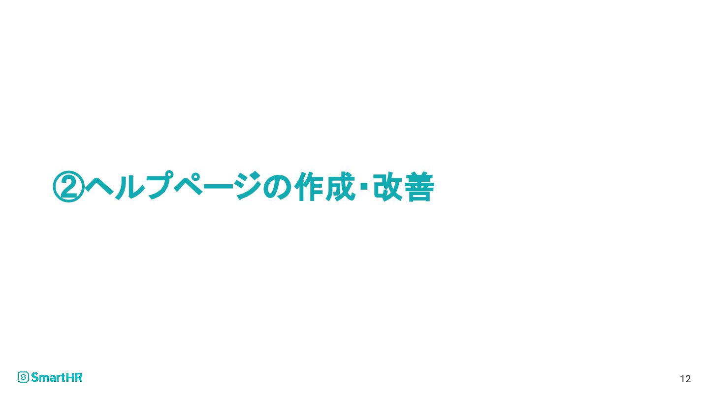 例:カスタマーサポートと連携した問い合わせ削減 11 • やったこと ◦ 従業員情報申請機能の問い合わせ削減 ▪ 削減する問い合わせのターゲット選定 ▪ 打ち手(ヘルプページの作成・改善
