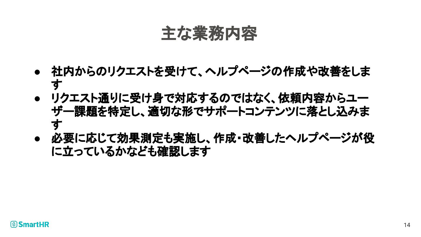 主な業務内容 • 社内からのリクエストを受けて、ヘルプページの作成や改善をしま す • リクエスト通りに受け身で対応するのではなく、依頼内容からユー ザー課題を特定し、適切な形でサポートコンテンツに落とし込みま す • 必要に応じて効果測定も実施し、作成・改善したヘルプページが役