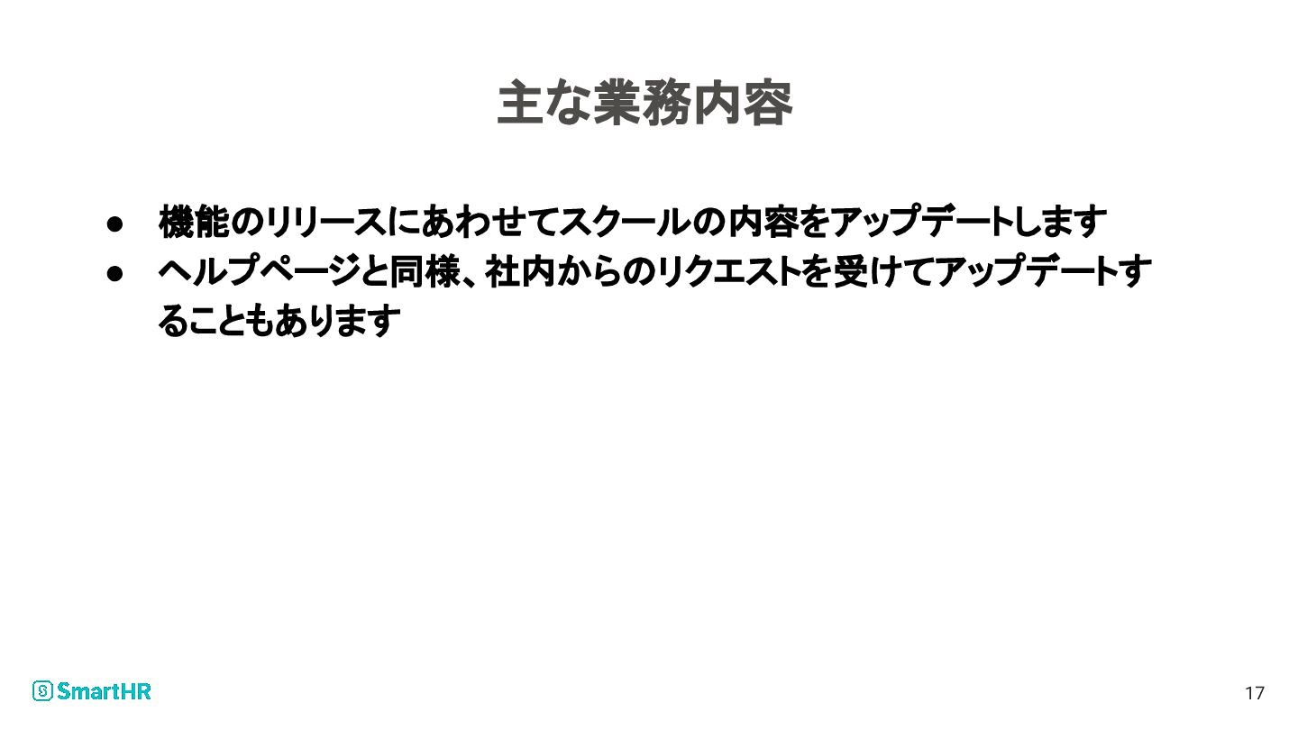 主な業務内容 • 機能のリリースにあわせてスクールの内容をアップデートします • ヘルプページと同様、社内からのリクエストを受けてアップデートす ることもあります 17