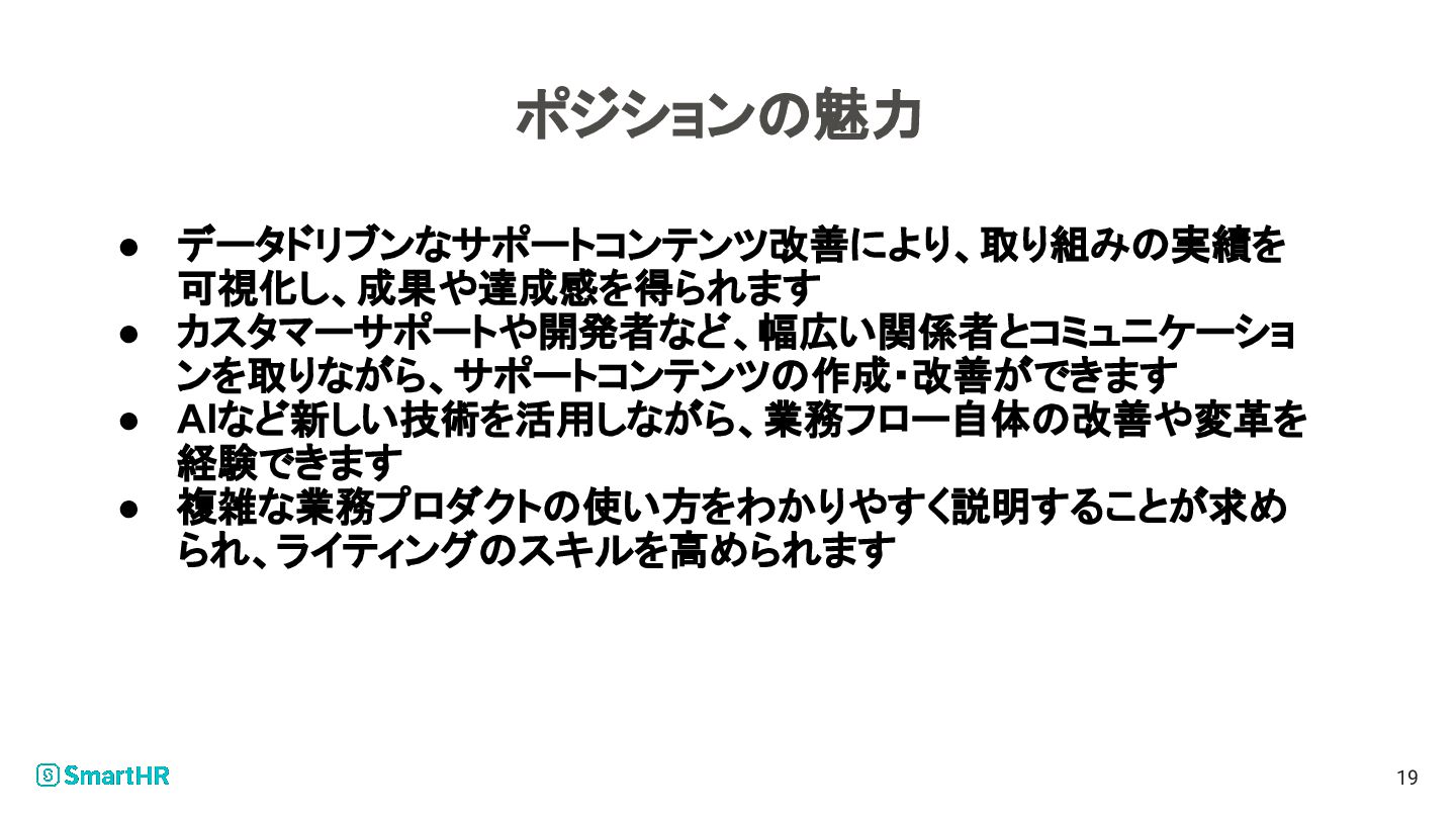 ポジションの魅力 • データドリブンなサポートコンテンツ改善により、取り組みの実績を 可視化し、成果や達成感を得られます • カスタマーサポートや開発者など、幅広い関係者とコミュニケーショ ンを取りながら、サポートコンテンツの作成・改善ができます • AIなど新しい技術を活用しながら、業務フロー自体の改善や変革を 経験できます