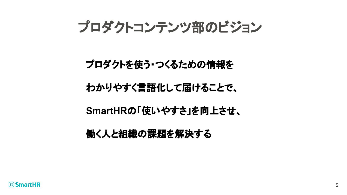 プロダクトコンテンツ部のビジョン 5 プロダクトを使う・つくるための情報を わかりやすく言語化して届けることで、 SmartHRの「使いやすさ」を向上させ、 働く人と組織の課題を解決する