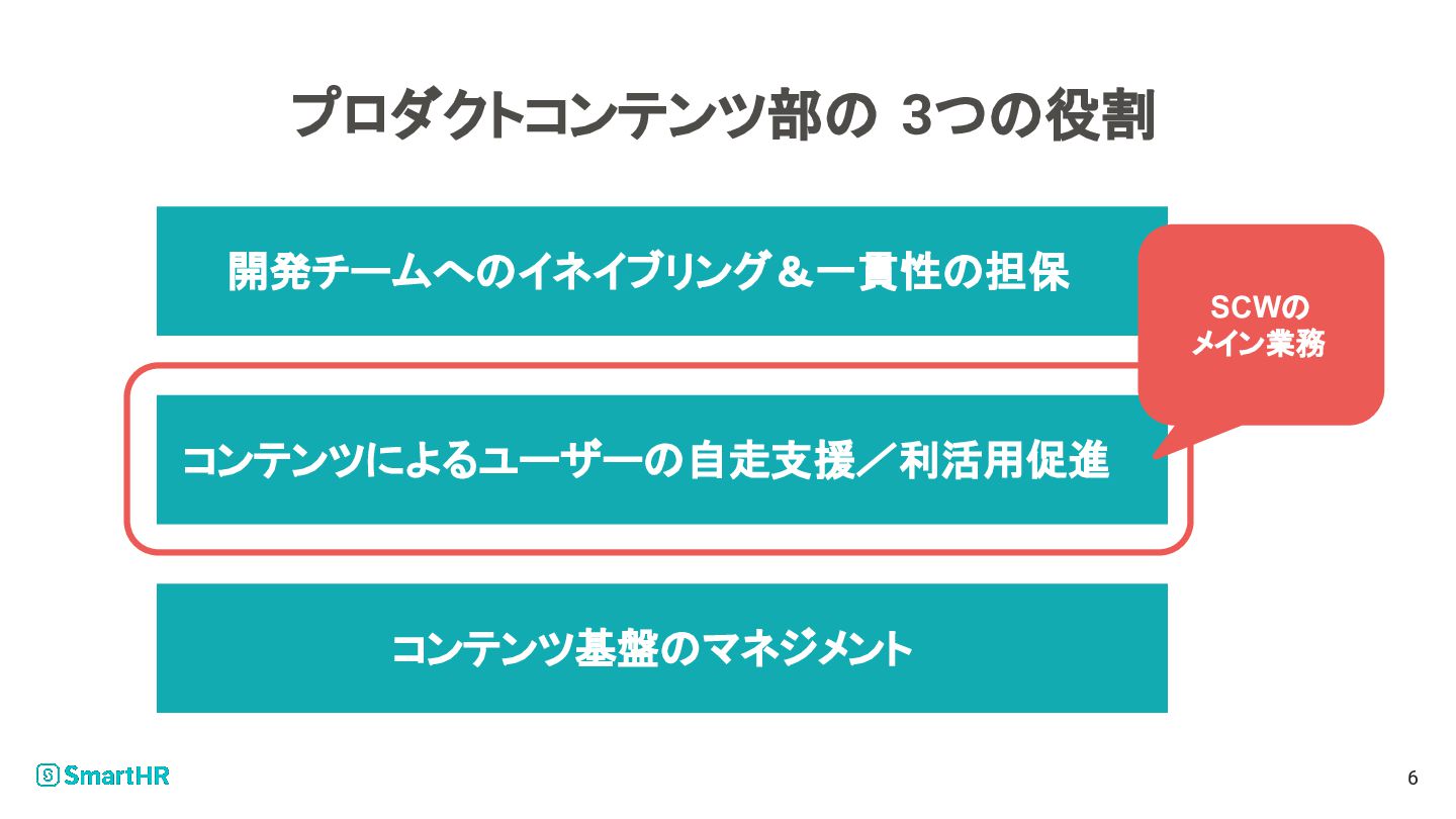 プロダクトコンテンツ部の 3つの役割 6 開発チームへのイネイブリング&一貫性の担保 コンテンツによるユーザーの自走支援/利活用促進 コンテンツ基盤のマネジメント SCWの メイン業務