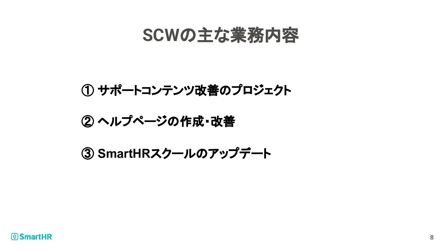 SCWの主な業務内容 8 ① サポートコンテンツ改善のプロジェクト ③ SmartHRスクールのアップデート ② ヘルプページの作成・改善