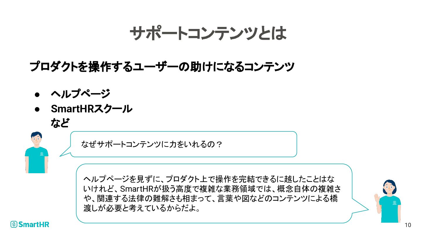 いけれど、SmartHRが扱う高度で複雑な業務領域では、概念自体の複雑さ や、関連する法律の難解さも相まって、言葉や図などのコンテンツによる橋 渡しが必要と考えているからだよ。