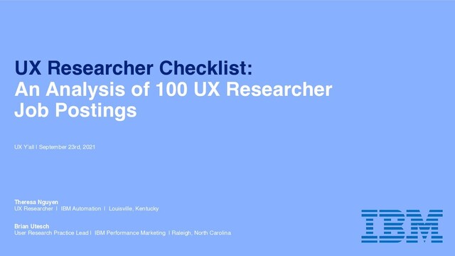 Job Postings UX Y’all | September 23rd, 2021 Brian Utesc h User Research Practice Lead | IBM Performance Marketing | Raleigh, North Carolina Theresa Nguye n UX Researcher | IBM Automation | Louisville, Kentucky