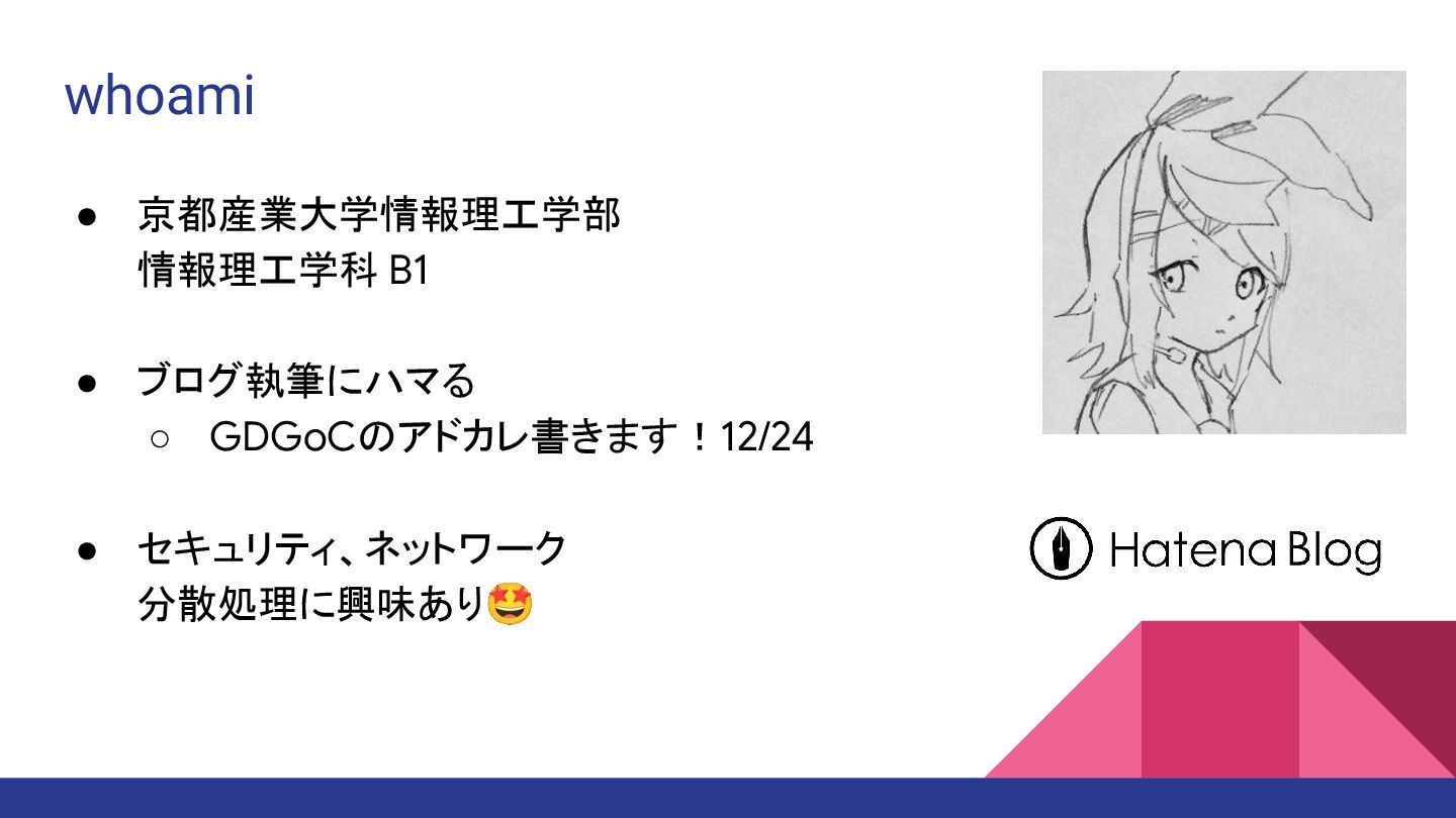 whoami • 京都産業大学情報理工学部 情報理工学科 B1 • ブログ執筆にハマる ◦ GDGoCのアドカレ書きます!12/24 •