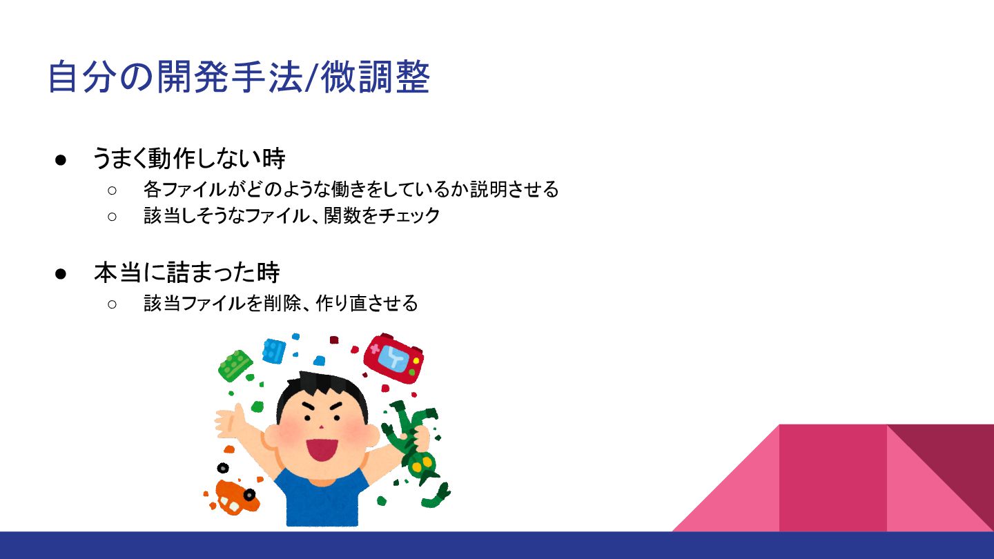 自分の開発手法/微調整 • うまく動作しない時 ◦ 各ファイルがどのような働きをしているか説明させる ◦ 該当しそうなファイル、関数をチェック • 本当に詰まった時 ◦