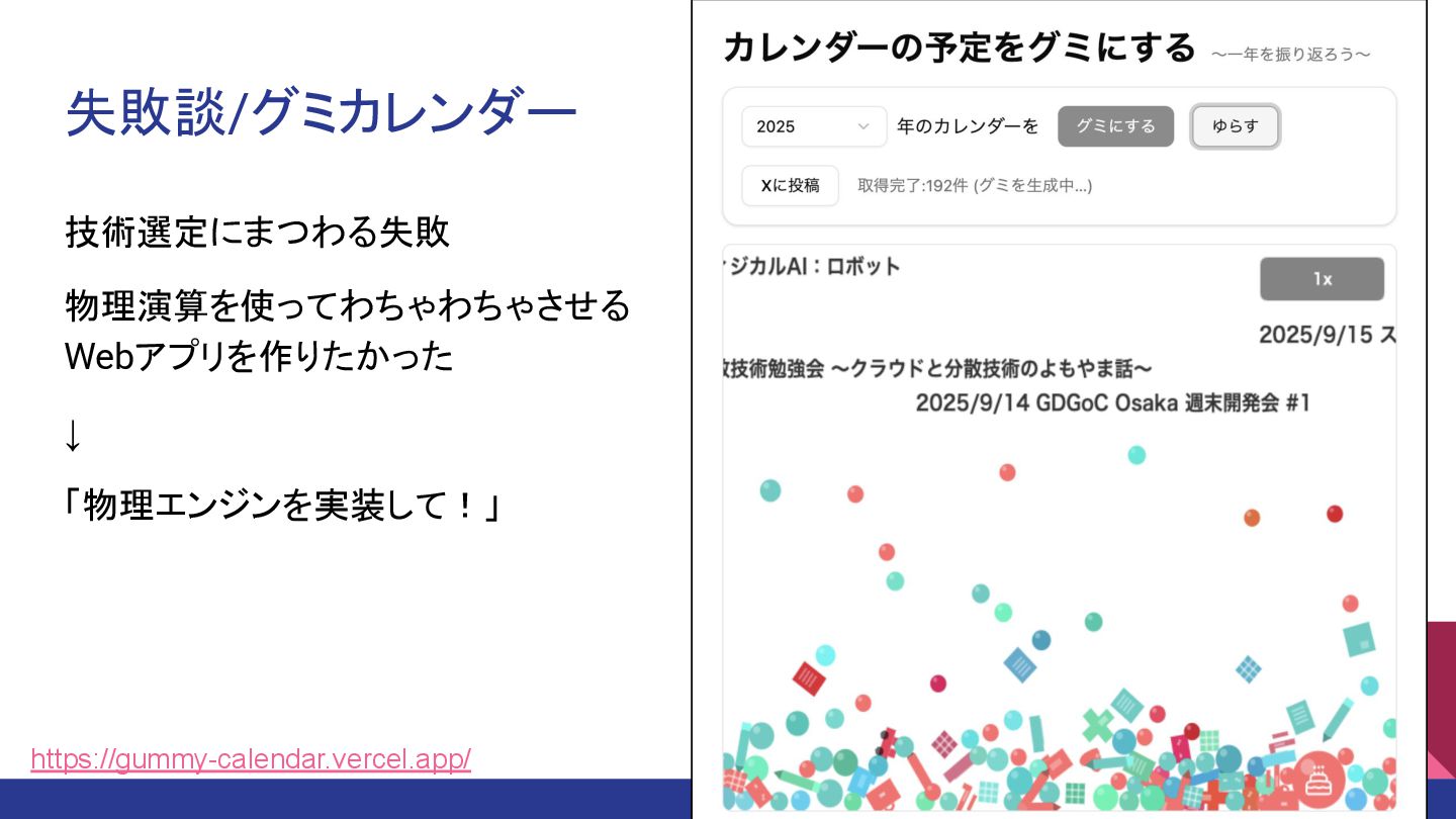 失敗談/グミカレンダー 技術選定にまつわる失敗 物理演算を使ってわちゃわちゃさせる Webアプリを作りたかった ↓ 「物理エンジンを実装して!」 https://gummy-calendar.vercel.app/