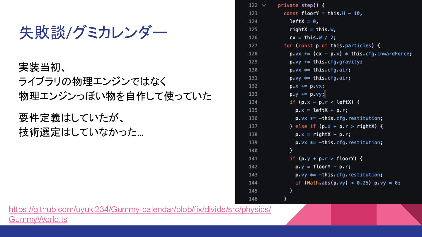 失敗談/グミカレンダー 実装当初、 ライブラリの物理エンジンではなく 物理エンジンっぽい物を自作して使っていた 要件定義はしていたが、 技術選定はしていなかった… https://github.com/uyuki234/Gummy-calendar/blob/fix/divide/src/physics/ GummyWorld.ts