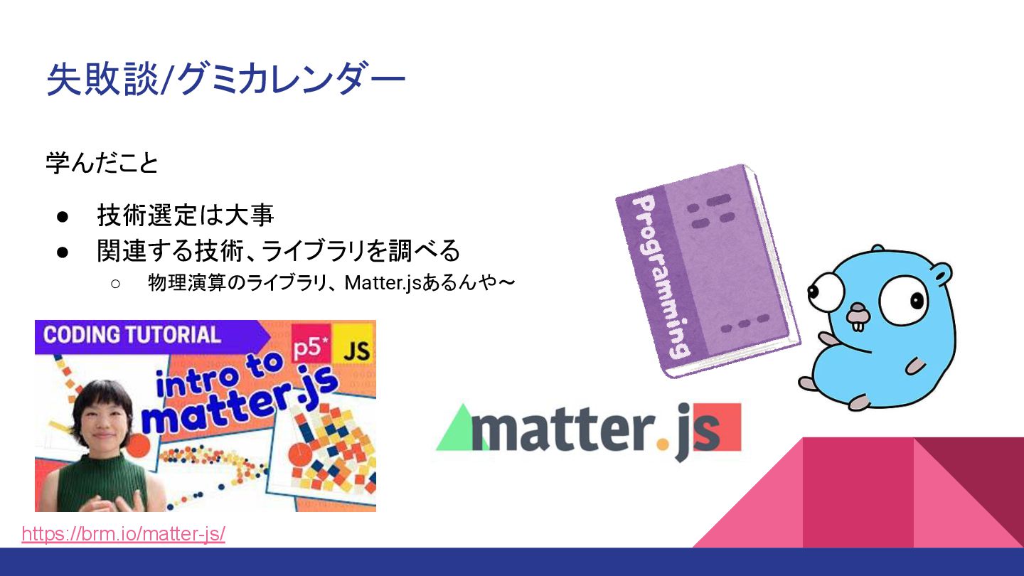 失敗談/グミカレンダー 学んだこと • 技術選定は大事 • 関連する技術、ライブラリを調べる ◦ 物理演算のライブラリ、 Matter.jsあるんや〜 https://brm.io/matter-js/