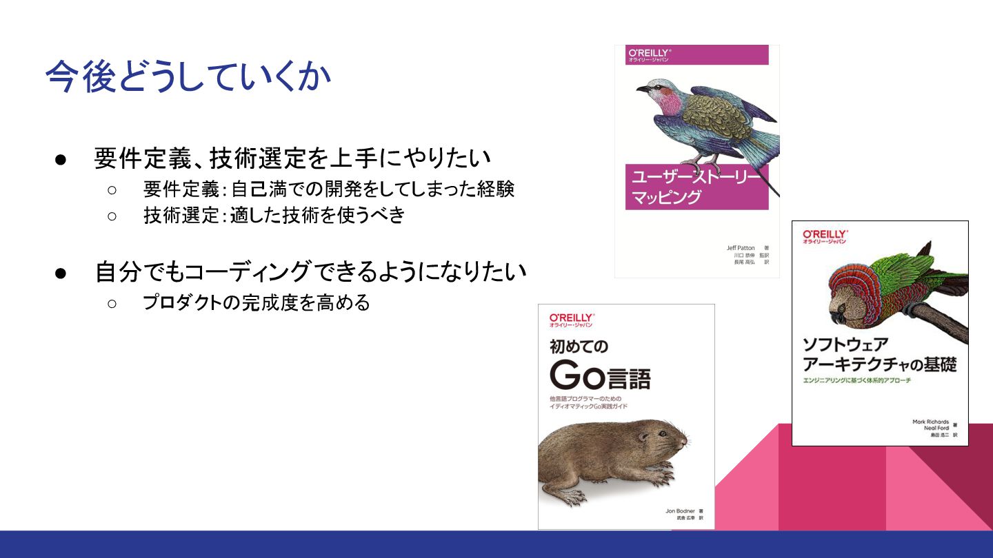 今後どうしていくか • 要件定義、技術選定を上手にやりたい ◦ 要件定義:自己満での開発をしてしまった経験 ◦ 技術選定:適した技術を使うべき • 自分でもコーディングできるようになりたい ◦