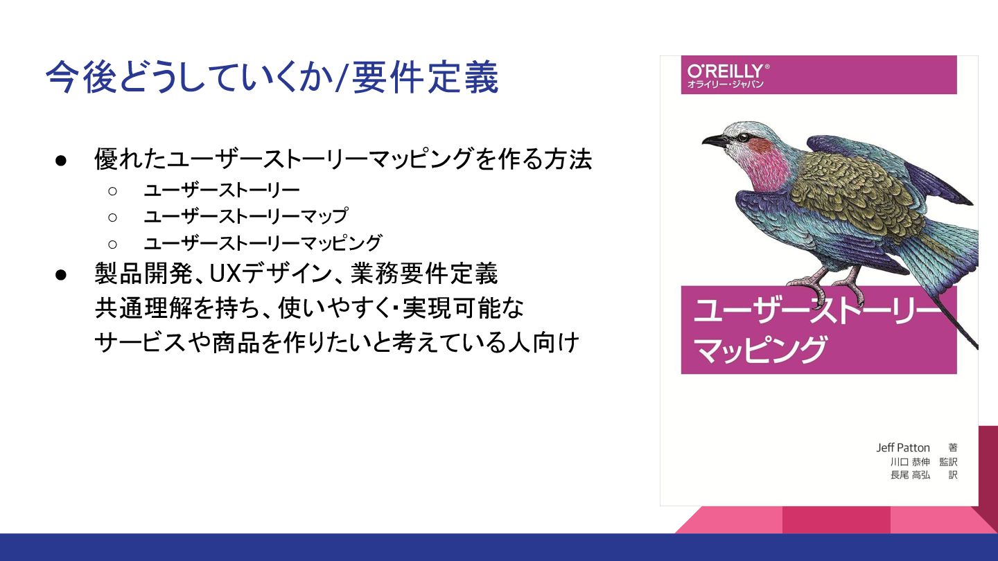 今後どうしていくか/要件定義 • 優れたユーザーストーリーマッピングを作る方法 ◦ ユーザーストーリー ◦ ユーザーストーリーマップ ◦ ユーザーストーリーマッピング •