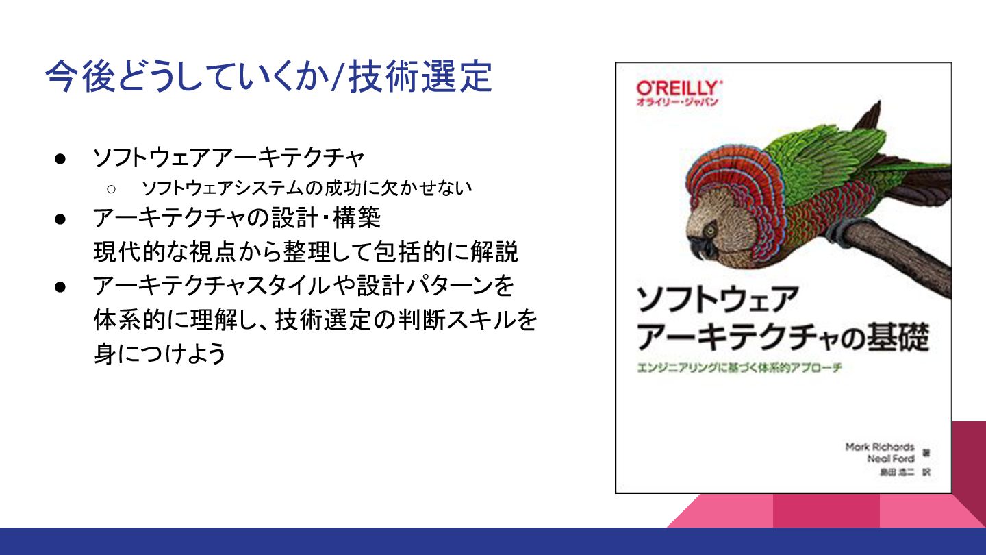 今後どうしていくか/技術選定 • ソフトウェアアーキテクチャ ◦ ソフトウェアシステムの成功に欠かせない • アーキテクチャの設計・構築 現代的な視点から整理して包括的に解説 • アーキテクチャスタイルや設計パターンを