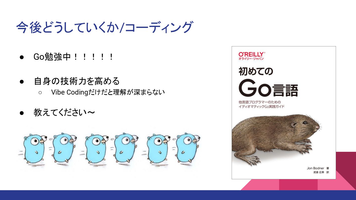 今後どうしていくか/コーディング • Go勉強中!!!!! • 自身の技術力を高める ◦ Vibe Codingだけだと理解が深まらない • 教えてください〜