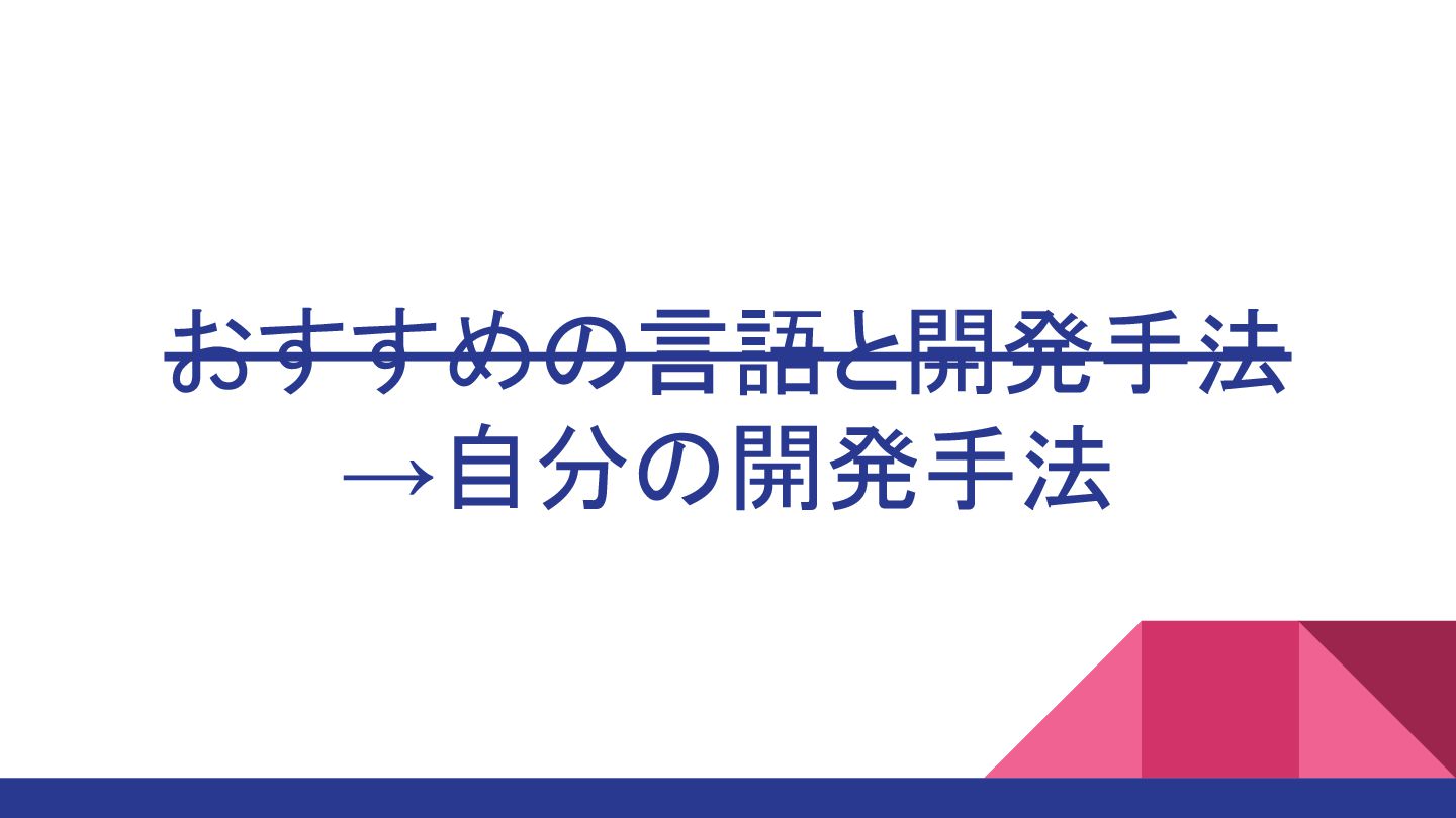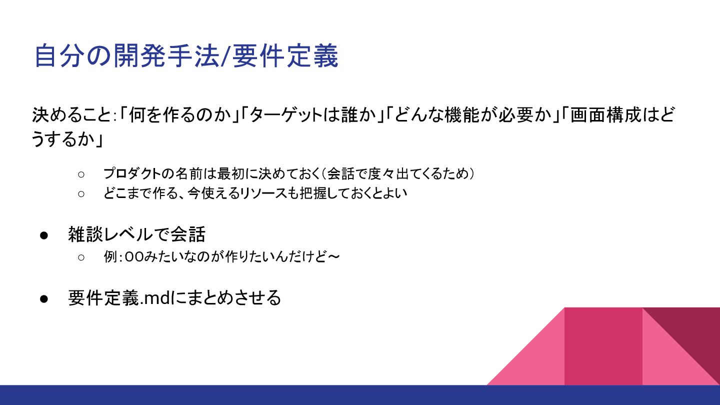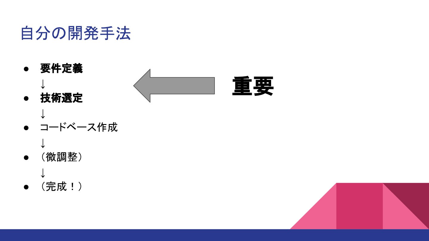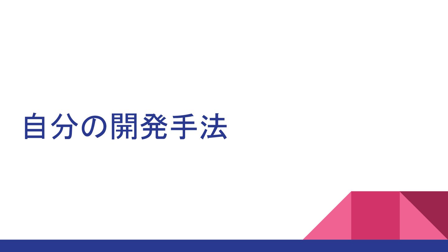 自分の開発手法 • 要件定義 ↓ • 技術選定 ↓ • コードベース作成 ↓