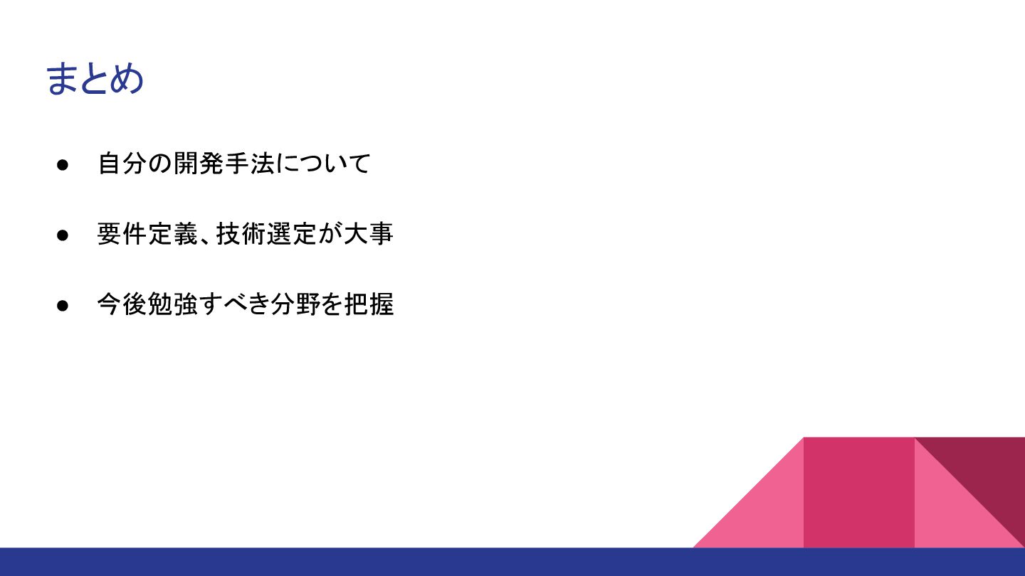 まとめ • 自分の開発手法について • 要件定義、技術選定が大事 • 今後勉強すべき分野を把握