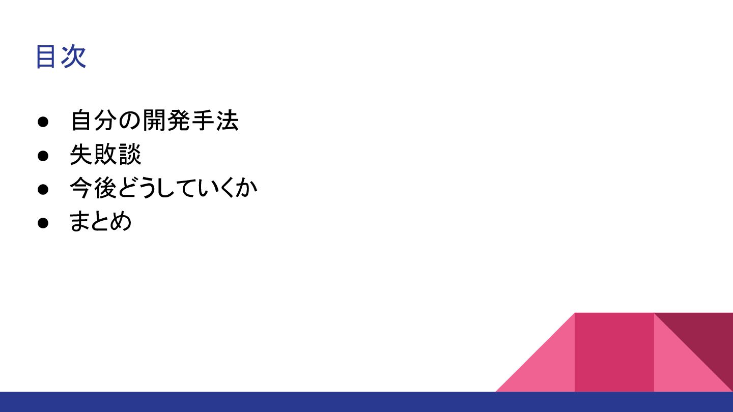 目次 • 自分の開発手法 • 失敗談 • 今後どうしていくか • まとめ
