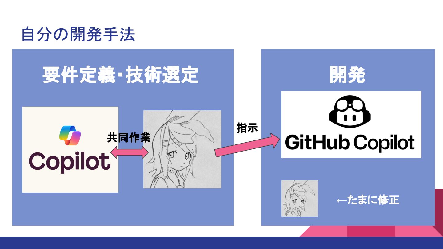 自分の開発手法 要件定義・技術選定 開発 ←たまに修正 指示 共同作業