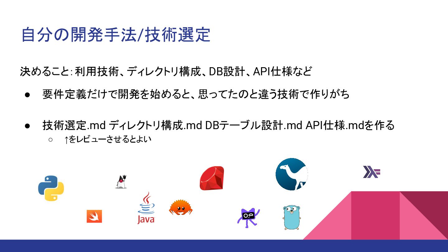 自分の開発手法/技術選定 決めること:利用技術、ディレクトリ構成、DB設計、API仕様など • 要件定義だけで開発を始めると、思ってたのと違う技術で作りがち • 技術選定.md ディレクトリ構成.md DBテーブル設計.md API仕様.mdを作る ◦