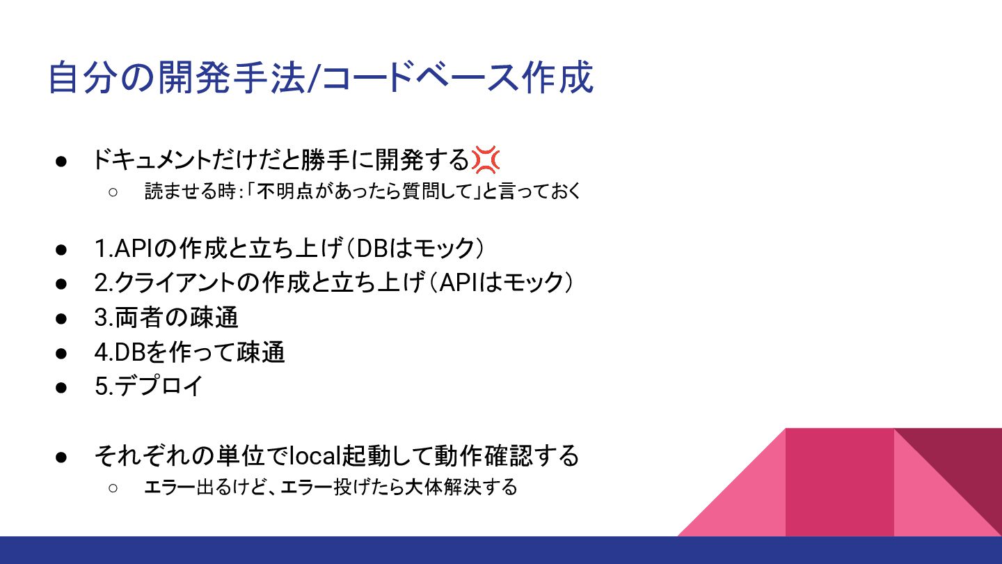 3.両者の疎通 • 4.DBを作って疎通 • 5.デプロイ • それぞれの単位でlocal起動して動作確認する ◦ エラー出るけど、エラー投げたら大体解決する