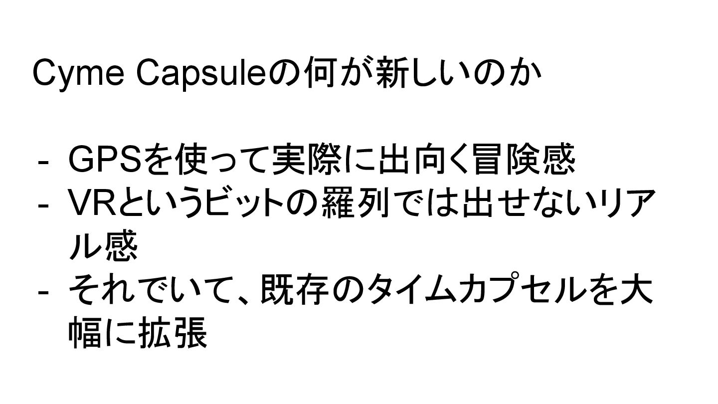 Cyme Capsuleの何が新しいのか - GPSを使って実際に出向く冒険感 - VRというビットの羅列では出せないリア ル感 - それでいて、既存のタイムカプセルを大 幅に拡張