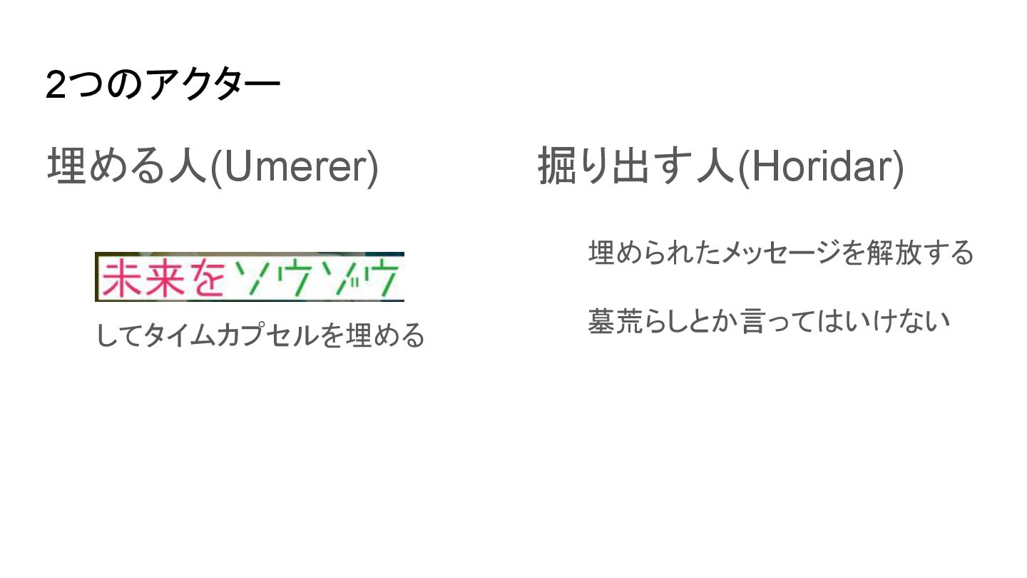 2つのアクター 埋める人(Umerer) してタイムカプセルを埋める 掘り出す人(Horidar) 埋められたメッセージを解放する 墓荒らしとか言ってはいけない