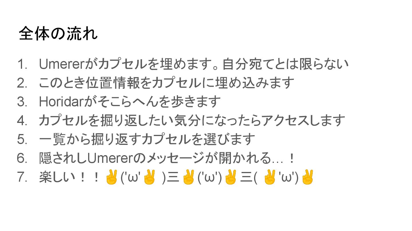 全体の流れ 1. Umererがカプセルを埋めます。自分宛てとは限らない 2. このとき位置情報をカプセルに埋め込みます 3. Horidarがそこらへんを歩きます 4. カプセルを掘り返したい気分になったらアクセスします 5.