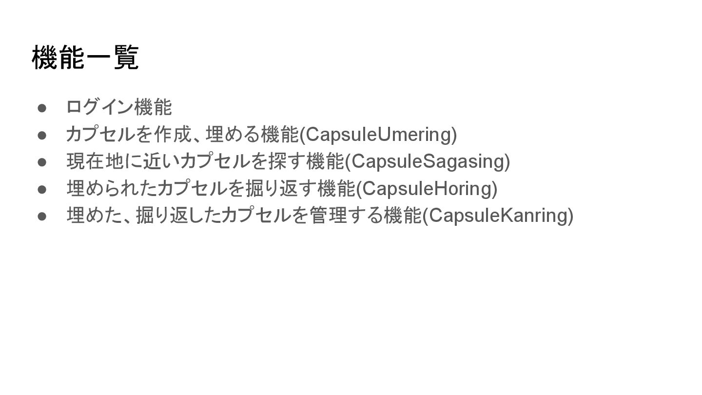 機能一覧 • ログイン機能 • カプセルを作成、埋める機能(CapsuleUmering) • 現在地に近いカプセルを探す機能(CapsuleSagasing) • 埋められたカプセルを掘り返す機能(CapsuleHoring) •