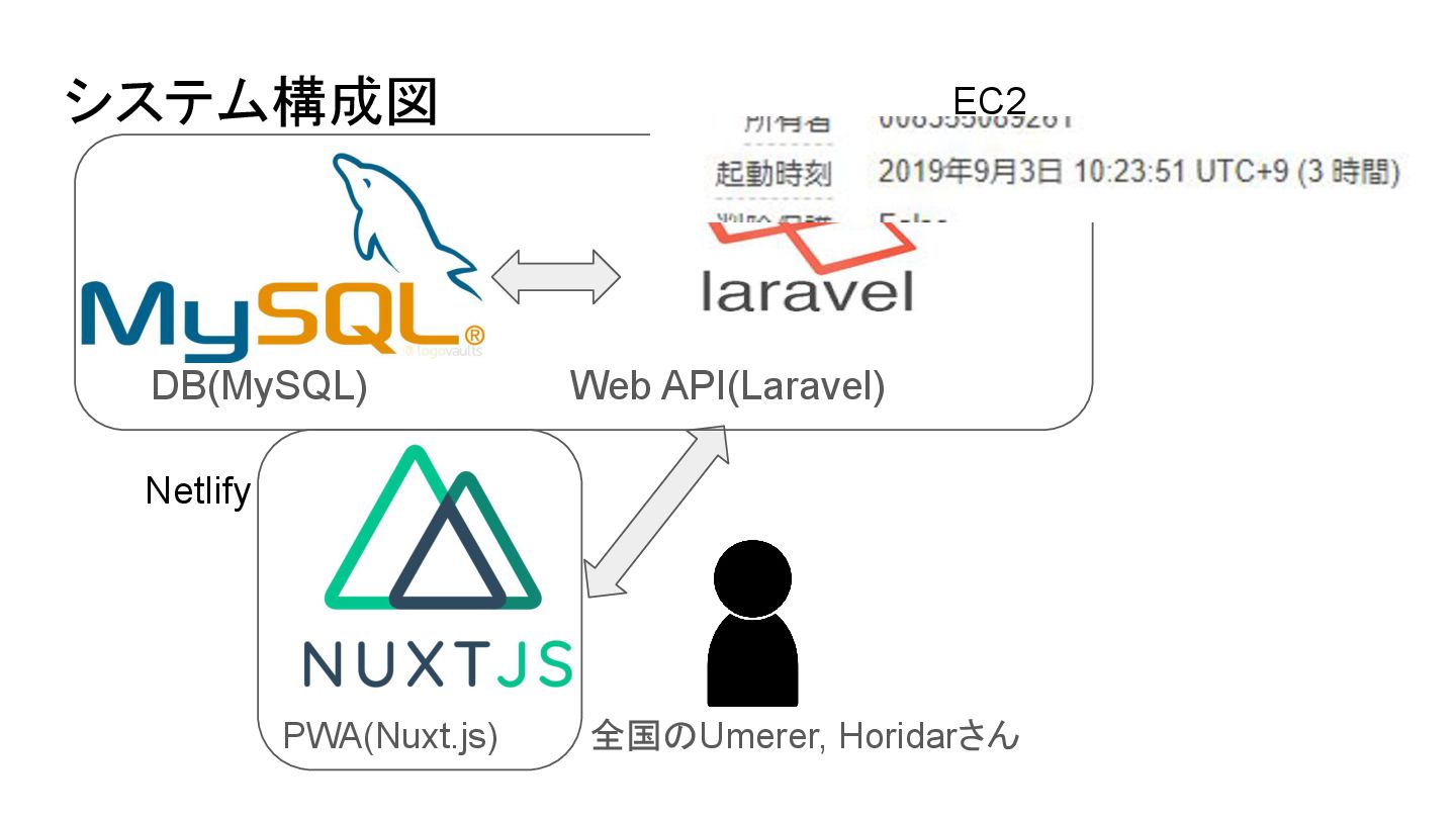 システム構成図 DB(MySQL) Web API(Laravel) PWA(Nuxt.js) 全国のUmerer, Horidarさん EC2 Netlify