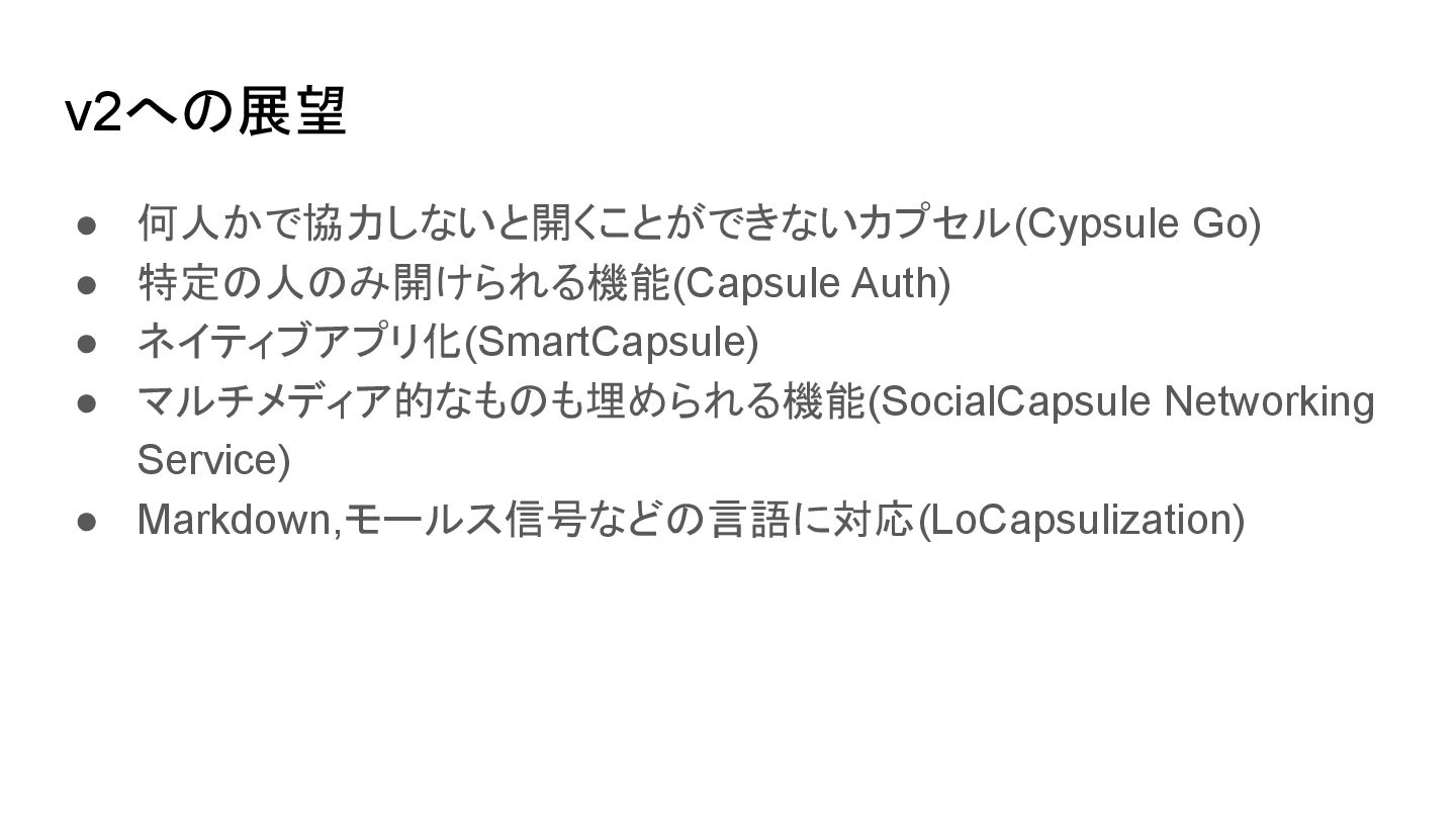 v2への展望 • 何人かで協力しないと開くことができないカプセル(Cypsule Go) • 特定の人のみ開けられる機能(Capsule Auth) • ネイティブアプリ化(SmartCapsule) •