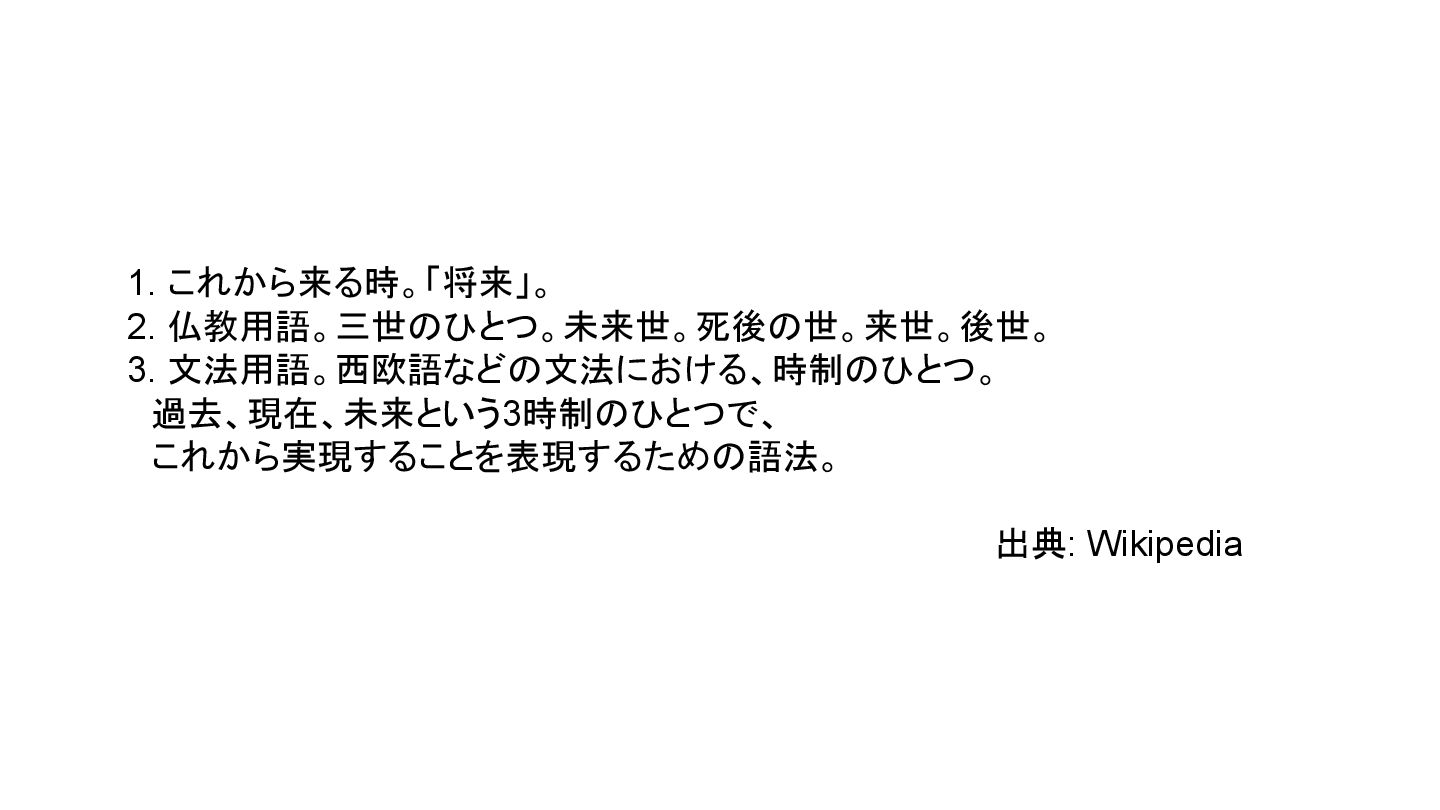 1. これから来る時。「将来」。 2. 仏教用語。三世のひとつ。未来世。死後の世。来世。後世。 3. 文法用語。西欧語などの文法における、時制のひとつ。 過去、現在、未来という3時制のひとつで、 これから実現することを表現するための語法。 出典: Wikipedia