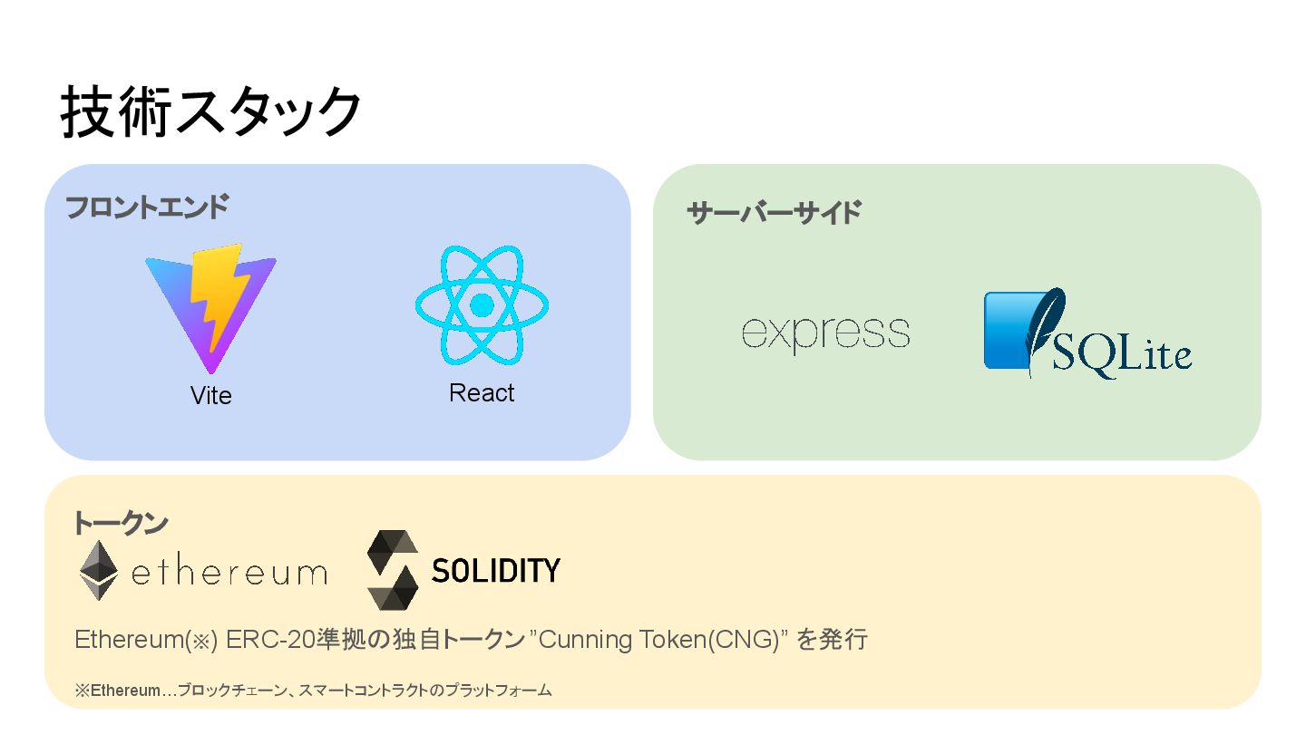 トークン Ethereum(※) ERC-20準拠の独自トークン ”Cunning Token(CNG)” を発行 ※Ethereum…ブロックチェーン、スマートコントラクトのプラットフォーム 技術スタック フロントエンド Vite