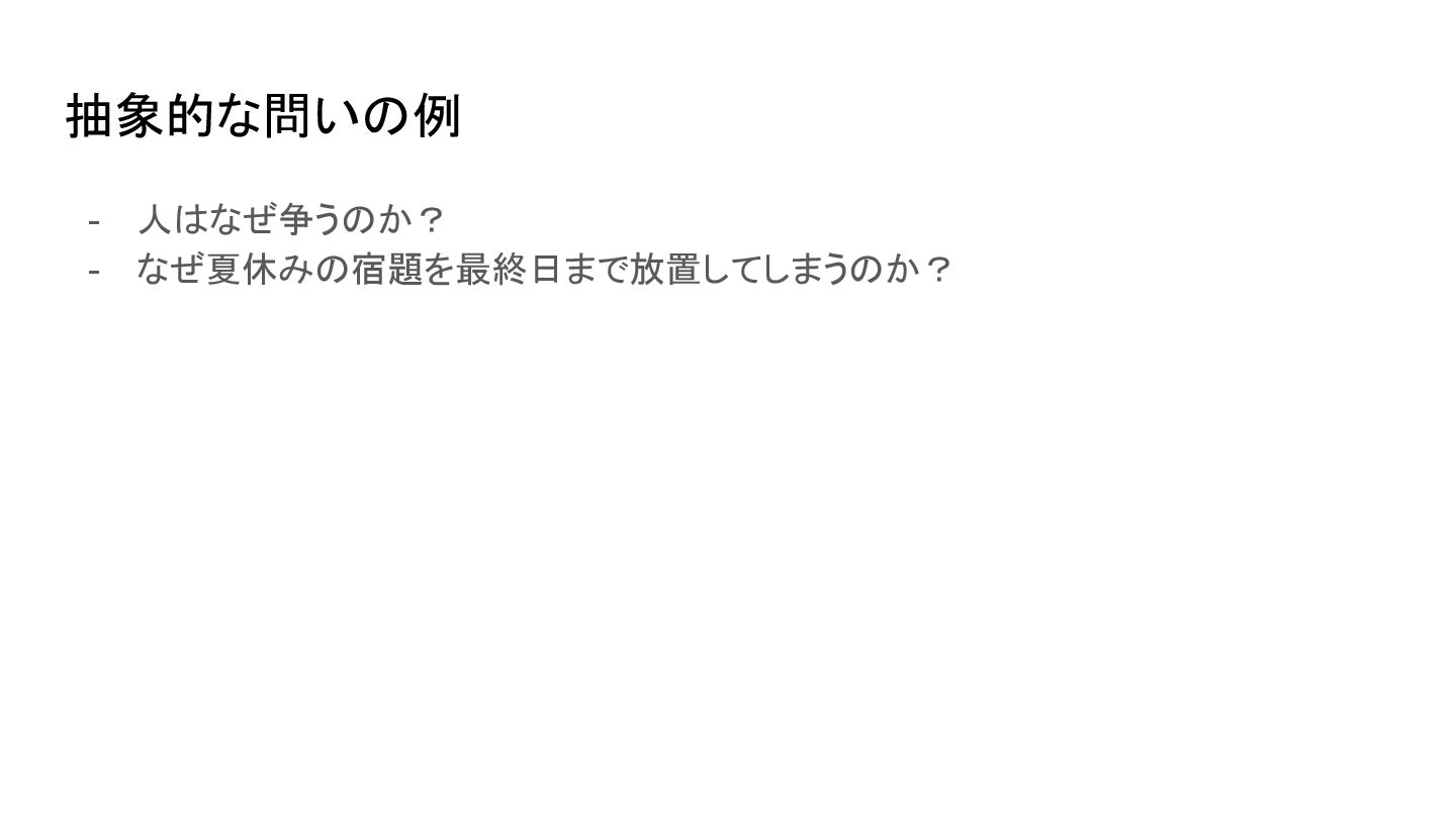 抽象的な問いの例 - 人はなぜ争うのか? - なぜ夏休みの宿題を最終日まで放置してしまうのか?