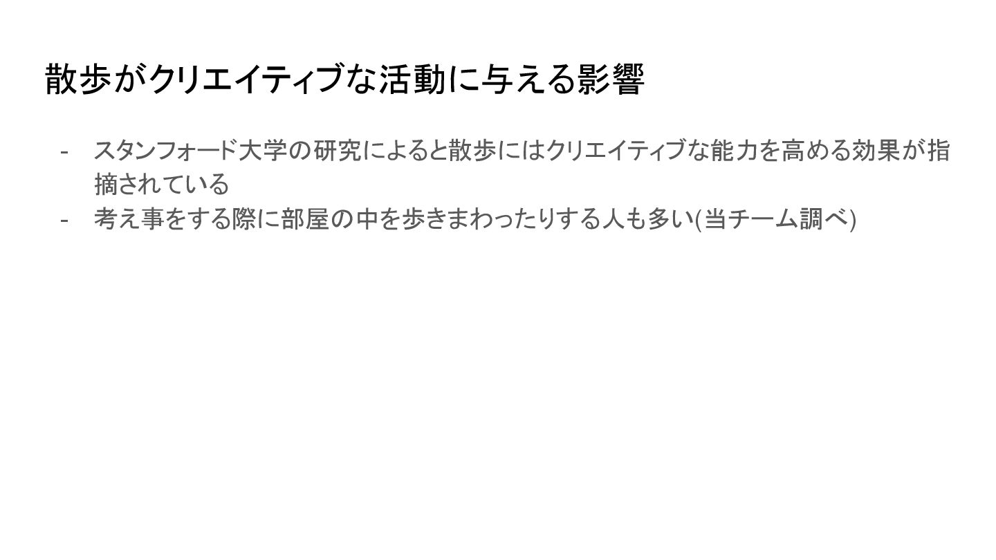 散歩がクリエイティブな活動に与える影響 - スタンフォード大学の研究によると散歩にはクリエイティブな能力を高める効果が指 摘されている - 考え事をする際に部屋の中を歩きまわったりする人も多い(当チーム調べ)