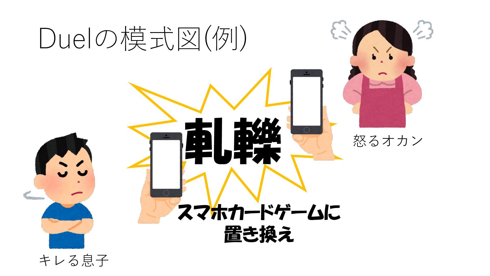 Duelの模式図(例) 怒るオカン キレる息子 軋轢 スマホカードゲームに 置き換え