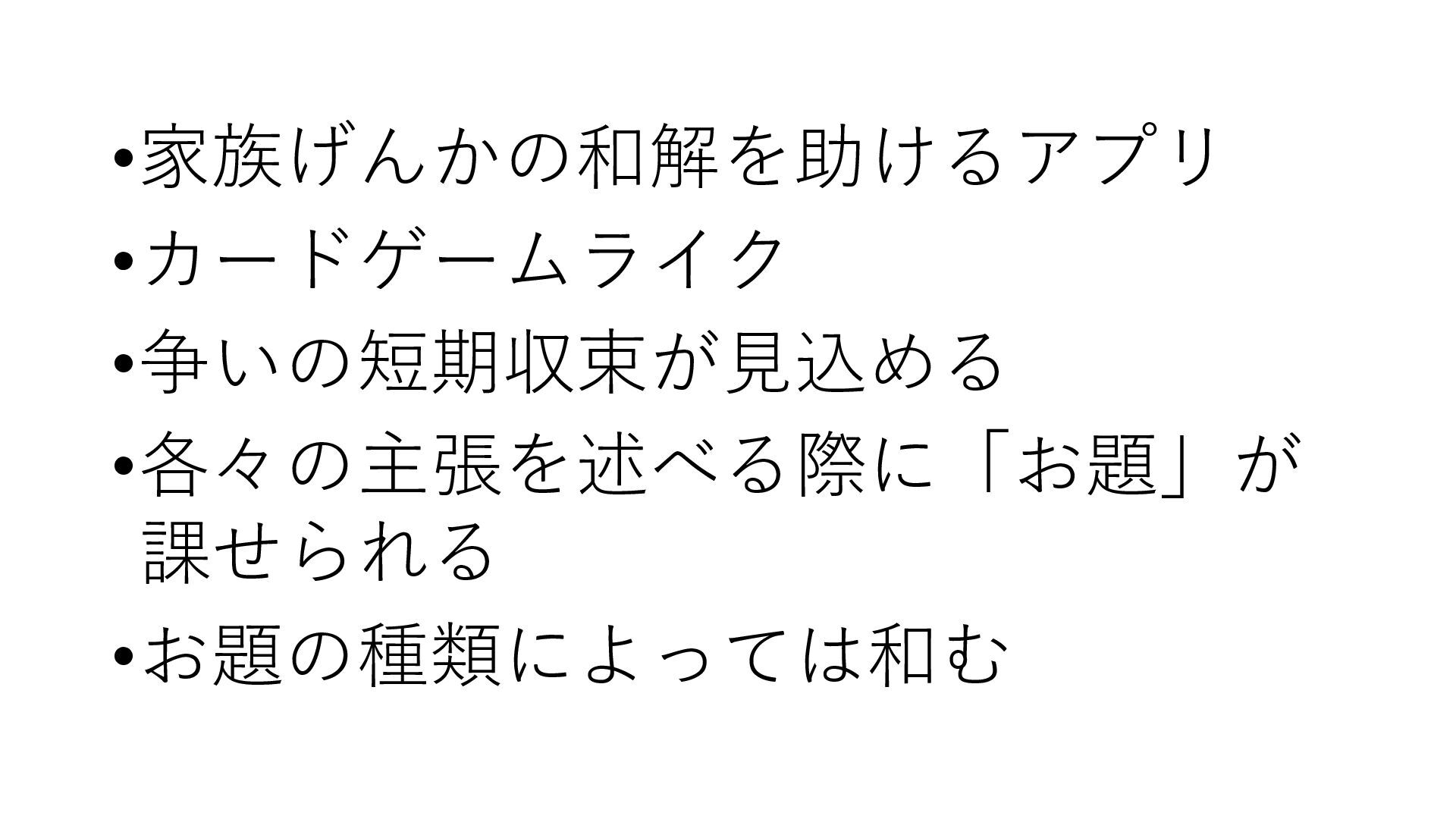 •家族げんかの和解を助けるアプリ •カードゲームライク •争いの短期収束が見込める •各々の主張を述べる際に「お題」が 課せられる •お題の種類によっては和む