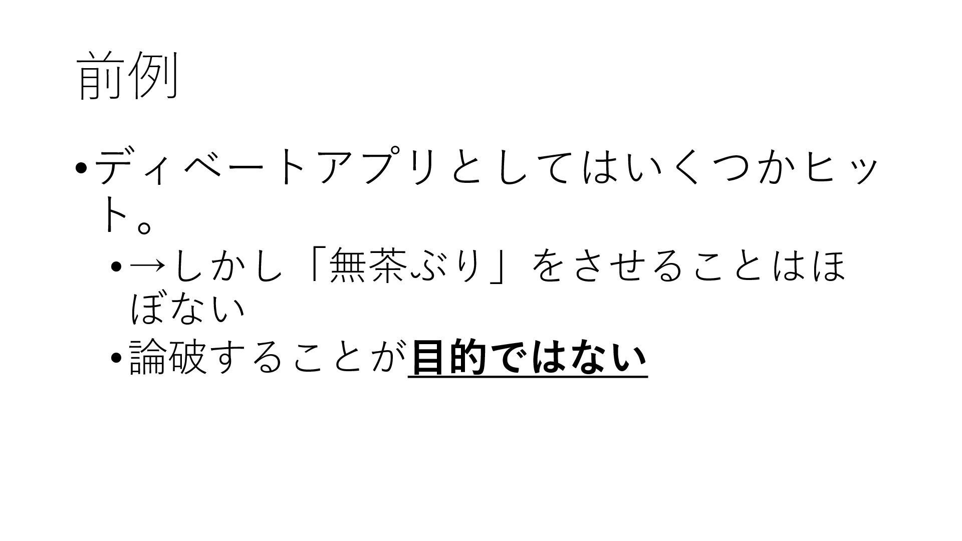 前例 •ディベートアプリとしてはいくつかヒッ ト。 •→しかし「無茶ぶり」をさせることはほ ぼない •論破することが目的ではない