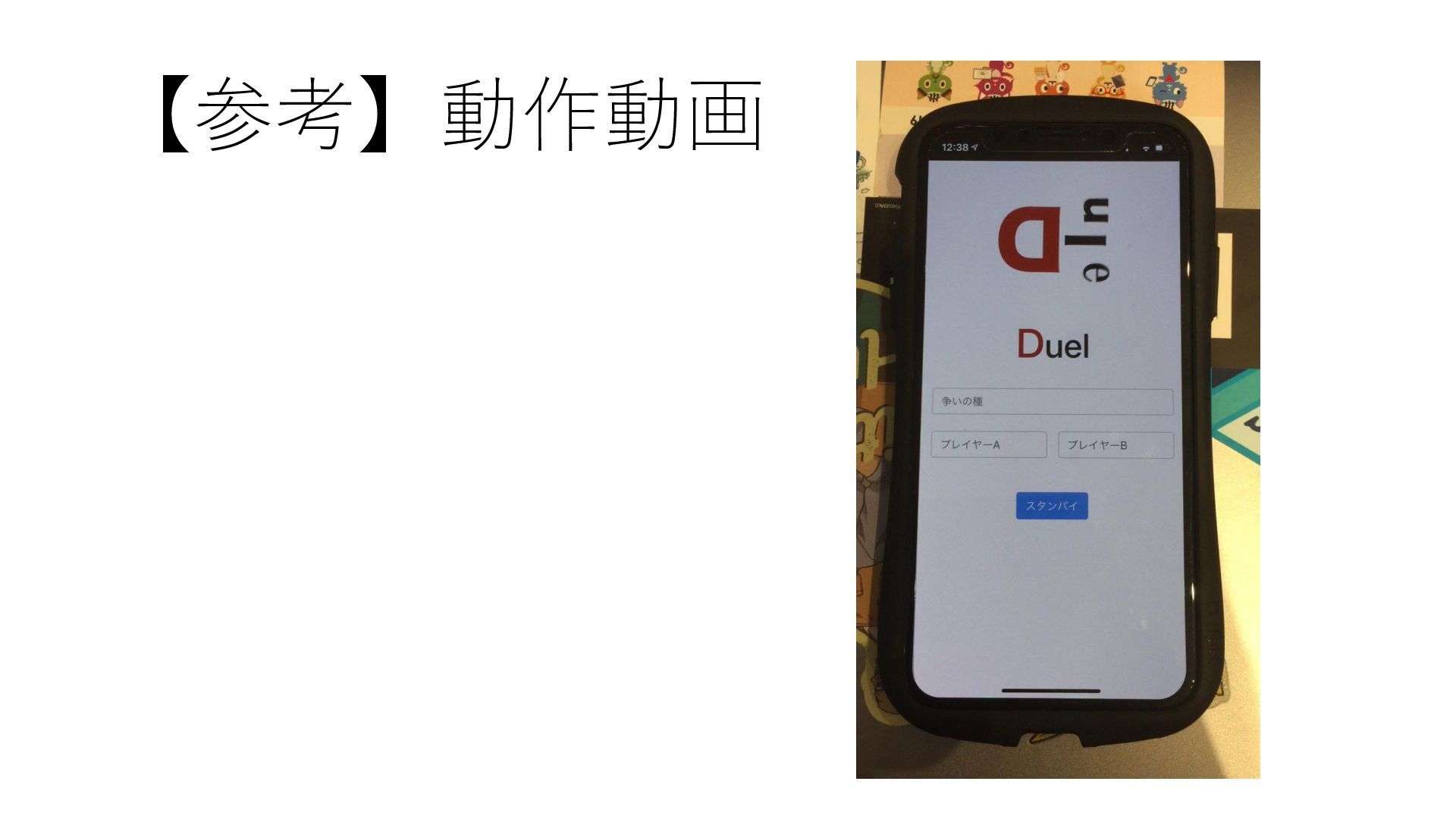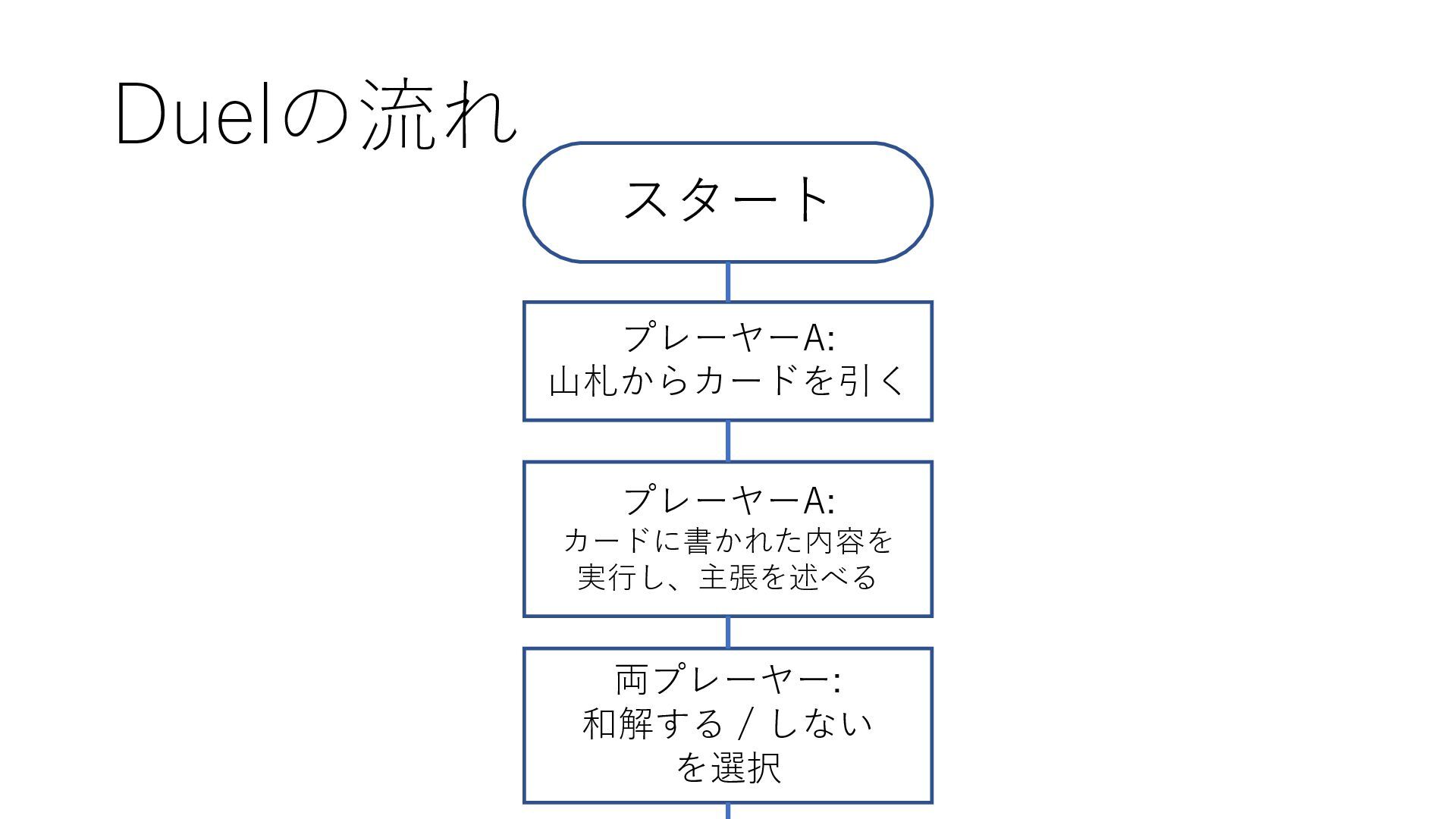 Duelの流れ スタート プレーヤーA: 山札からカードを引く プレーヤーA: カードに書かれた内容を 実行し、主張を述べる 両プレーヤー: 和解する /
