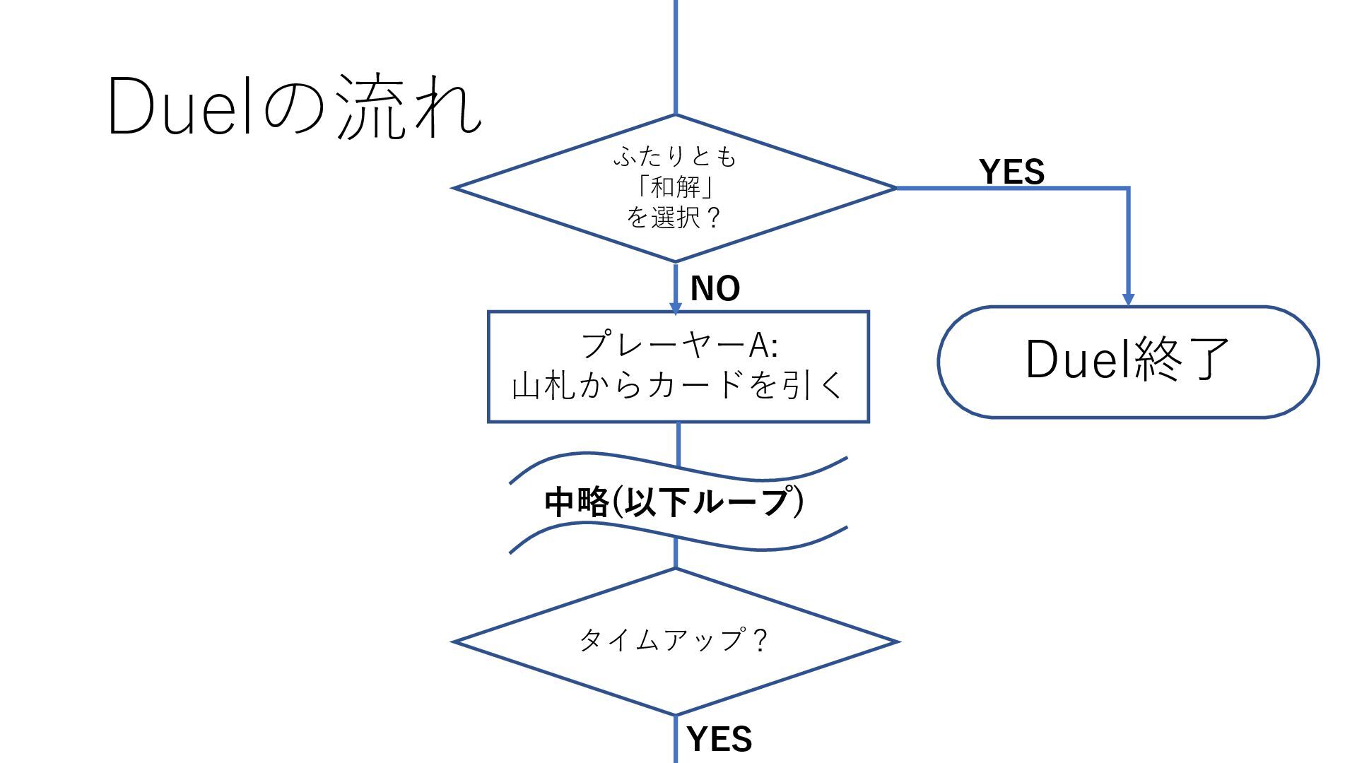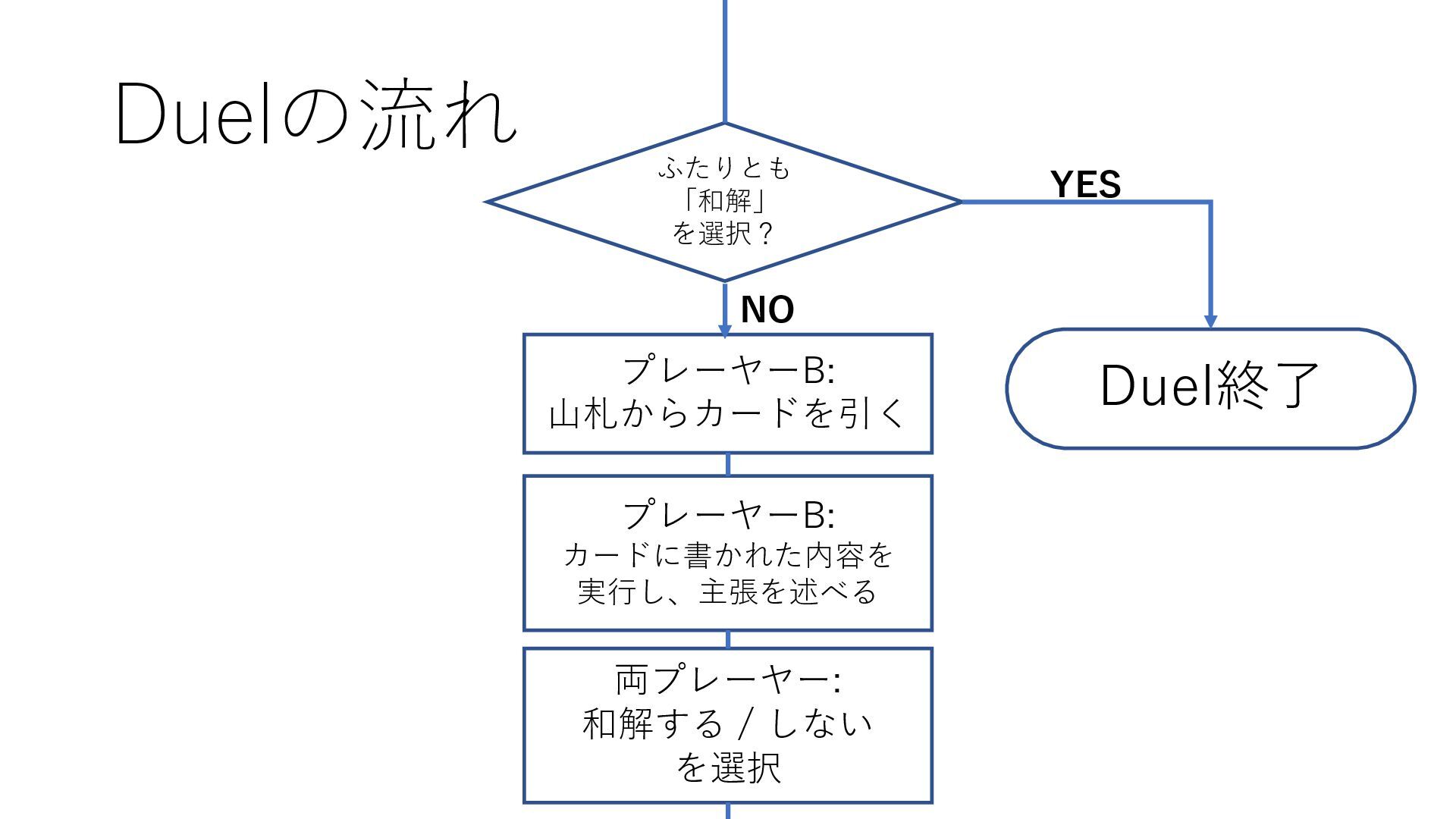 Duelの流れ Duel終了 プレーヤーA: 山札からカードを引く ふたりとも 「和解」 を選択? YES NO 中略(以下ループ)