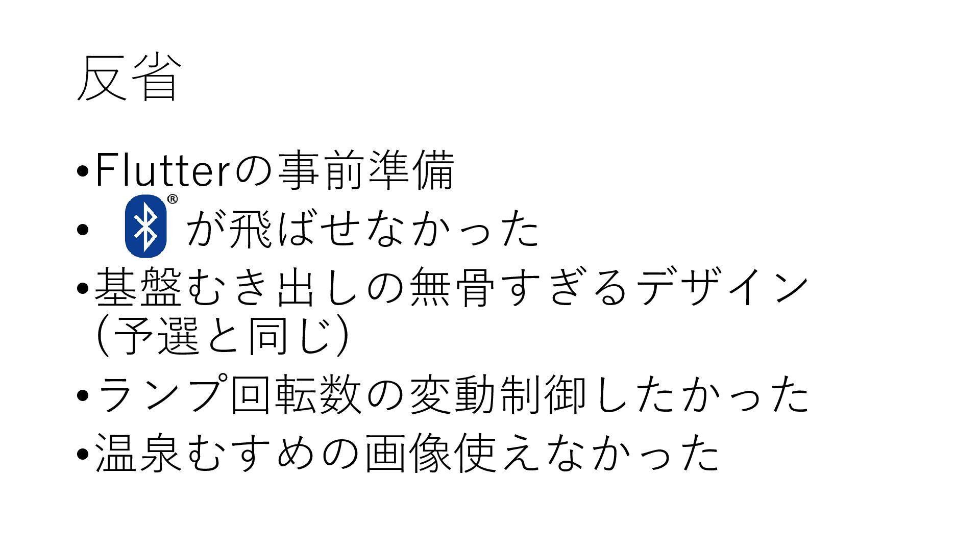 反省 •Flutterの事前準備 • が飛ばせなかった •基盤むき出しの無骨すぎるデザイン (予選と同じ) •ランプ回転数の変動制御したかった •温泉むすめの画像使えなかった
