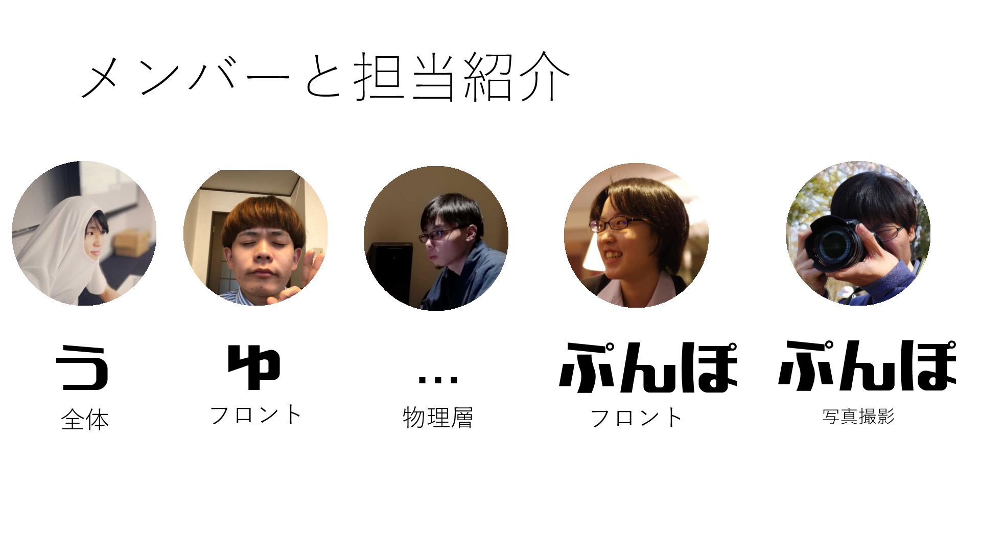 メンバーと担当紹介 ぅ 全体 ゅ フロント ... 物理層 ぷんぽ フロント ぷんぽ