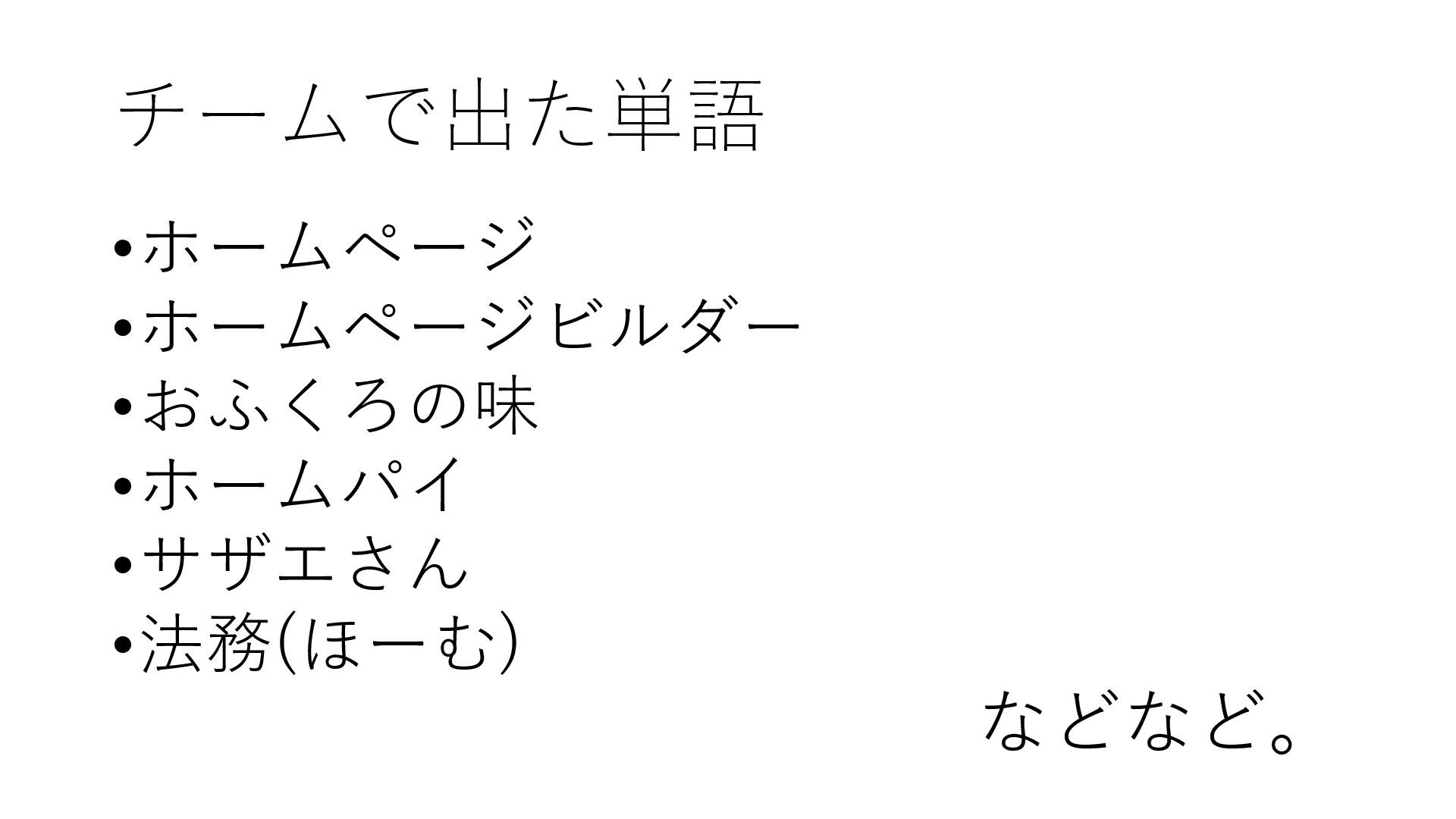 チームで出た単語 •ホームページ •ホームページビルダー •おふくろの味 •ホームパイ •サザエさん •法務(ほーむ) などなど。